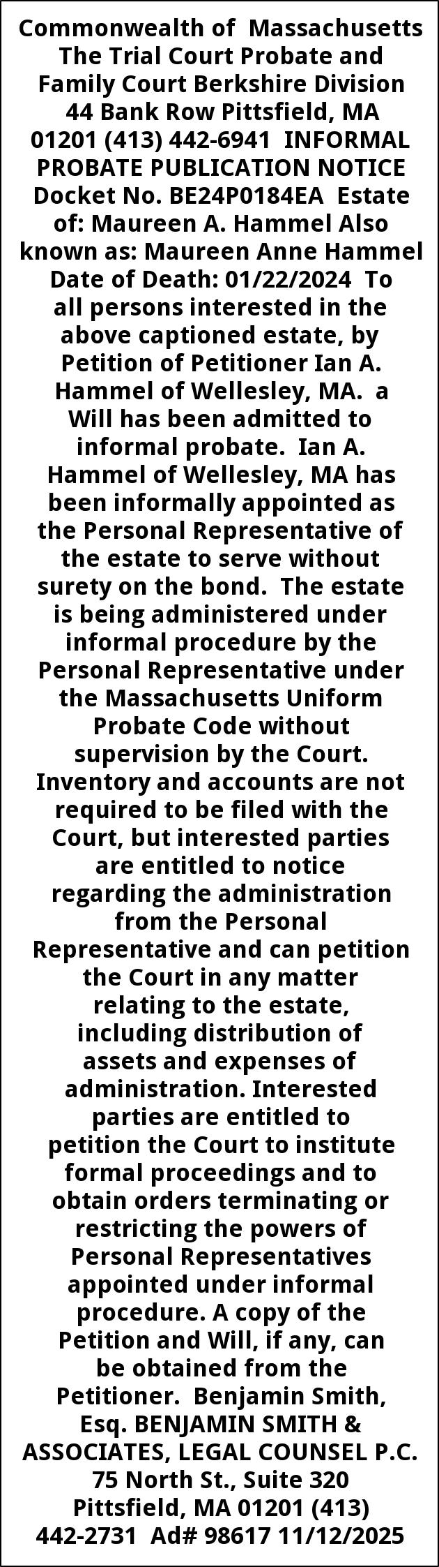 Commonwealth of Massachusetts The Trial Court Probate and Family Court Berkshire Division 44 Bank Row Pittsfield, MA 01201 (413) 442-6941 INFORMAL PROBATE PUBLICATION NOTICE Docket No. BE24P0184EA Estate of: Maureen A. Hammel Also known as: Maureen Anne Hammel Date of Death: 01/22/2024 To all persons interested in the above captioned estate, by Petition of Petitioner Ian A. Hammel of Wellesley, MA. a Will has been admitted to informal probate. Ian A. Hammel of Wellesley, MA has been informally appointed as the Personal Representative of the estate to serve without surety on the bond. The estate is being administered under informal procedure by the Personal Representative under the Massachusetts Uniform Probate Code without supervision by the Court. Inventory and accounts are not required to be filed with the Court, but interested parties are entitled to notice regarding the administration from the Personal Representative and can petition the Court in any matter relating to the estate, including distribution of assets and expenses of administration. Interested parties are entitled to petition the Court to institute formal proceedings and to obtain orders terminating or restricting the powers of Personal Representatives appointed under informal procedure. A copy of the Petition and Will, if any, can be obtained from the Petitioner. Benjamin Smith, Esq. BENJAMIN SMITH & ASSOCIATES, LEGAL COUNSEL P.C. 75 North St., Suite 320 Pittsfield, MA 01201 (413) 442-2731 Ad# 98617 11/12/2025