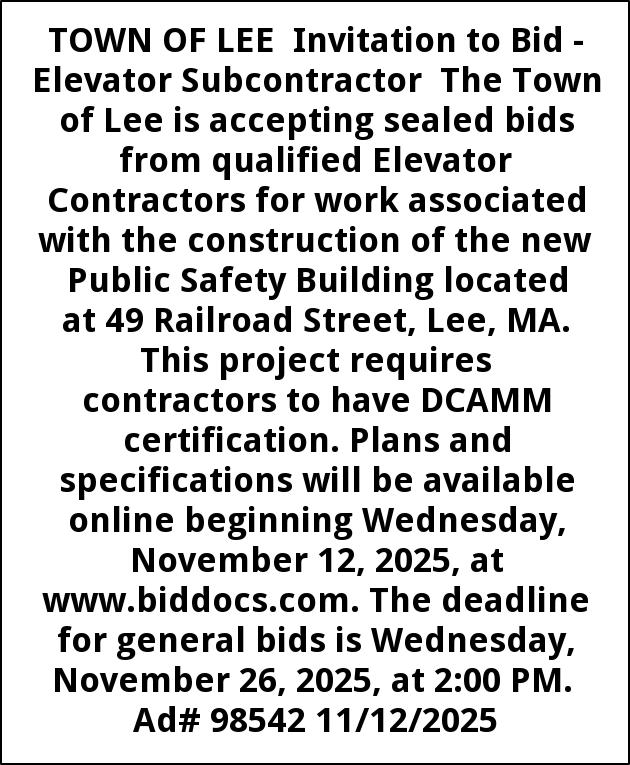 TOWN OF LEE Invitation to Bid - Elevator Subcontractor The Town of Lee is accepting sealed bids from qualified Elevator Contractors for work associated with the construction of the new Public Safety Building located at 49 Railroad Street, Lee, MA. This project requires contractors to have DCAMM certification. Plans and specifications will be available online beginning Wednesday, November 12, 2025, at www.biddocs.com. The deadline for general bids is Wednesday, November 26, 2025, at 2:00 PM. Ad# 98542 11/12/2025