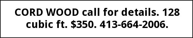CORD WOOD call for details. 128 cubic ft. $350. 413-664-2006.