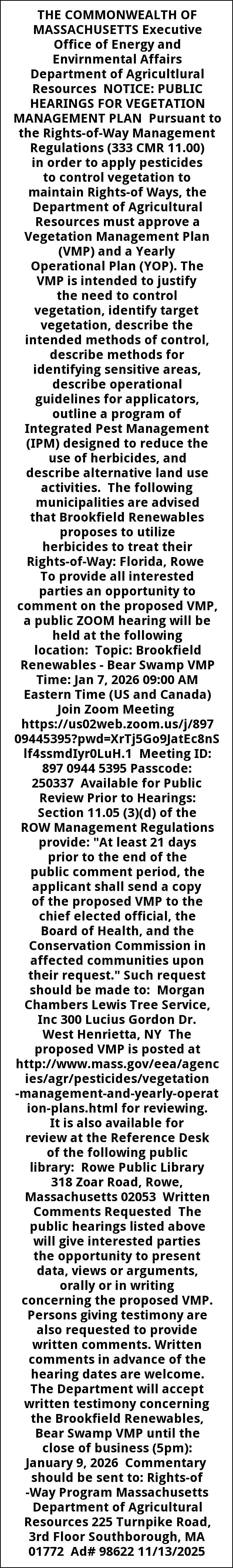 THE COMMONWEALTH OF MASSACHUSETTS Executive Office of Energy and Envirnmental Affairs Department of Agricultlural Resources NOTICE: PUBLIC HEARINGS FOR VEGETATION MANAGEMENT PLAN Pursuant to the Rights-of-Way Management Regulations (333 CMR 11.00) in order to apply pesticides to control vegetation to maintain Rights-of Ways, the Department of Agricultural Resources must approve a Vegetation Management Plan (VMP) and a Yearly Operational Plan (YOP). The VMP is intended to justify the need to control vegetation, identify target vegetation, describe the intended methods of control, describe methods for identifying sensitive areas, describe operational guidelines for applicators, outline a program of Integrated Pest Management (IPM) designed to reduce the use of herbicides, and describe alternative land use activities. The following municipalities are advised that Brookfield Renewables proposes to utilize herbicides to treat their Rights-of-Way: Florida, Rowe To provide all interested parties an opportunity to comment on the proposed VMP, a public ZOOM hearing will be held at the following location: Topic: Brookfield Renewables - Bear Swamp VMP Time: Jan 7, 2026 09:00 AM Eastern Time (US and Canada) Join Zoom Meeting https://us02web.zoom.us/j/89709445395?pwd=XrTj5Go9JatEc8nSlf4ssmdIyr0LuH.1 Meeting ID: 897 0944 5395 Passcode: 250337 Available for Public Review Prior to Hearings: Section 11.05 (3)(d) of the ROW Management Regulations provide: "At least 21 days prior to the end of the public comment period, the applicant shall send a copy of the proposed VMP to the chief elected official, the Board of Health, and the Conservation Commission in affected communities upon their request." Such request should be made to: Morgan Chambers Lewis Tree Service, Inc 300 Lucius Gordon Dr. West Henrietta, NY The proposed VMP is posted at http://www.mass.gov/eea/agencies/agr/pesticides/vegetation-management-and-yearly-operation-plans.html for reviewing. It is also available for review at the Reference Desk of the following public library: Rowe Public Library 318 Zoar Road, Rowe, Massachusetts 02053 Written Comments Requested The public hearings listed above will give interested parties the opportunity to present data, views or arguments, orally or in writing concerning the proposed VMP. Persons giving testimony are also requested to provide written comments. Written comments in advance of the hearing dates are welcome. The Department will accept written testimony concerning the Brookfield Renewables, Bear Swamp VMP until the close of business (5pm): January 9, 2026 Commentary should be sent to: Rights-of -Way Program Massachusetts Department of Agricultural Resources 225 Turnpike Road, 3rd Floor Southborough, MA 01772 Ad# 98622 11/13/2025