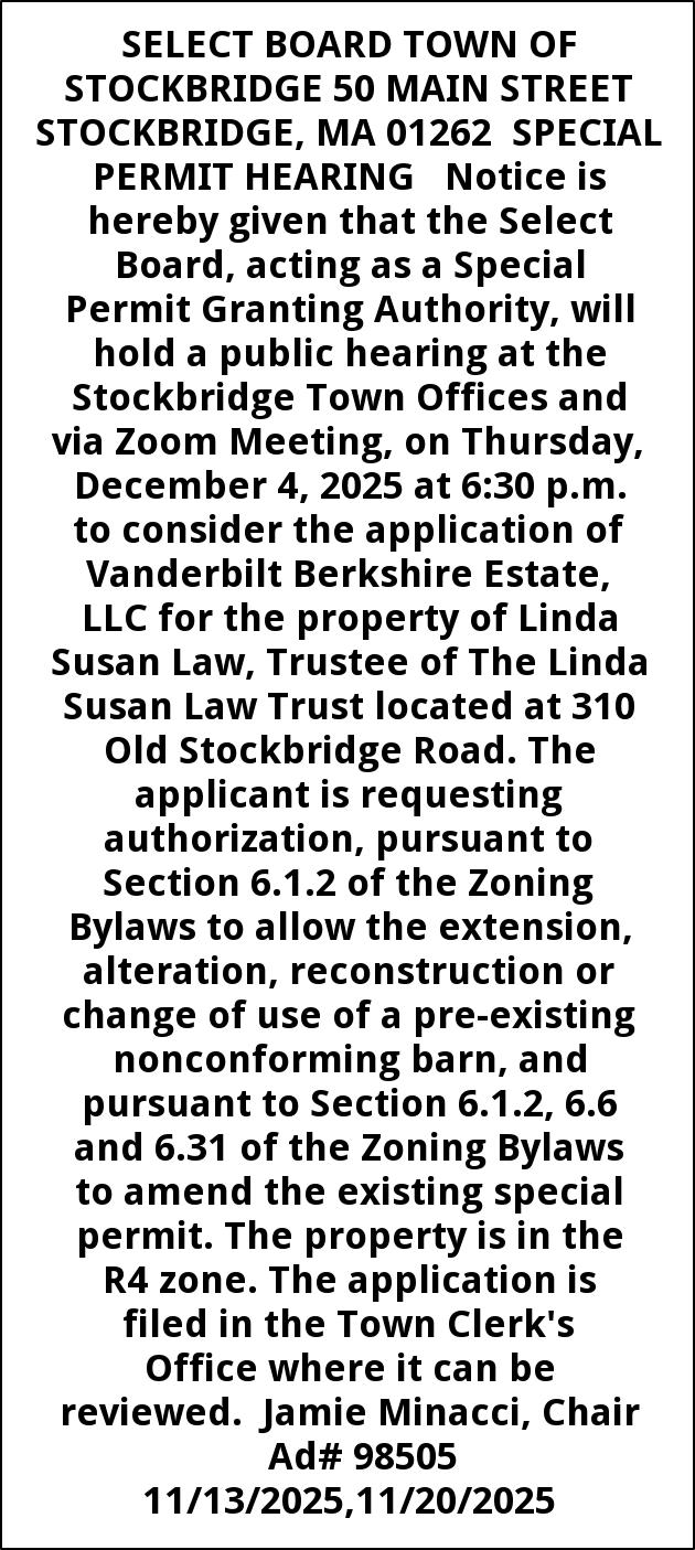 SELECT BOARD TOWN OF STOCKBRIDGE 50 MAIN STREET STOCKBRIDGE, MA 01262 SPECIAL PERMIT HEARING Notice is hereby given that the Select Board, acting as a Special Permit Granting Authority, will hold a public hearing at the Stockbridge Town Offices and via Zoom Meeting, on Thursday, December 4, 2025 at 6:30 p.m. to consider the application of Vanderbilt Berkshire Estate, LLC for the property of Linda Susan Law, Trustee of The Linda Susan Law Trust located at 310 Old Stockbridge Road. The applicant is requesting authorization, pursuant to Section 6.1.2 of the Zoning Bylaws to allow the extension, alteration, reconstruction or change of use of a pre-existing nonconforming barn, and pursuant to Section 6.1.2, 6.6 and 6.31 of the Zoning Bylaws to amend the existing special permit. The property is in the R4 zone. The application is filed in the Town Clerk's Office where it can be reviewed. Jamie Minacci, Chair Ad# 98505 11/13/2025,11/20/2025