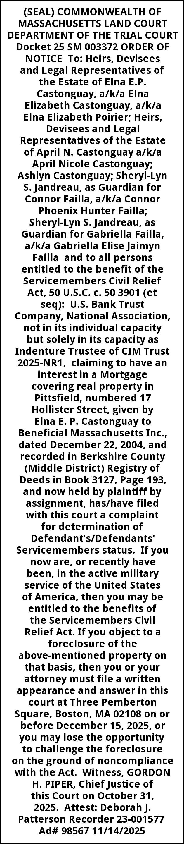 (SEAL) COMMONWEALTH OF MASSACHUSETTS LAND COURT DEPARTMENT OF THE TRIAL COURT Docket 25 SM 003372 ORDER OF NOTICE To: Heirs, Devisees and Legal Representatives of the Estate of Elna E.P. Castonguay, a/k/a Elna Elizabeth Castonguay, a/k/a Elna Elizabeth Poirier; Heirs, Devisees and Legal Representatives of the Estate of April N. Castonguay a/k/a April Nicole Castonguay; Ashlyn Castonguay; Sheryl-Lyn S. Jandreau, as Guardian for Connor Failla, a/k/a Connor Phoenix Hunter Failla; Sheryl-Lyn S. Jandreau, as Guardian for Gabriella Failla, a/k/a Gabriella Elise Jaimyn Failla and to all persons entitled to the benefit of the Servicemembers Civil Relief Act, 50 U.S.C. c. 50 3901 (et seq): U.S. Bank Trust Company, National Association, not in its individual capacity but solely in its capacity as Indenture Trustee of CIM Trust 2025-NR1, claiming to have an interest in a Mortgage covering real property in Pittsfield, numbered 17 Hollister Street, given by Elna E. P. Castonguay to Beneficial Massachusetts Inc., dated December 22, 2004, and recorded in Berkshire County (Middle District) Registry of Deeds in Book 3127, Page 193, and now held by plaintiff by assignment, has/have filed with this court a complaint for determination of Defendant's/Defendants' Servicemembers status. If you now are, or recently have been, in the active military service of the United States of America, then you may be entitled to the benefits of the Servicemembers Civil Relief Act. If you object to a foreclosure of the above-mentioned property on that basis, then you or your attorney must file a written appearance and answer in this court at Three Pemberton Square, Boston, MA 02108 on or before December 15, 2025, or you may lose the opportunity to challenge the foreclosure on the ground of noncompliance with the Act. Witness, GORDON H. PIPER, Chief Justice of this Court on October 31, 2025. Attest: Deborah J. Patterson Recorder 23-001577 Ad# 98567 11/14/2025