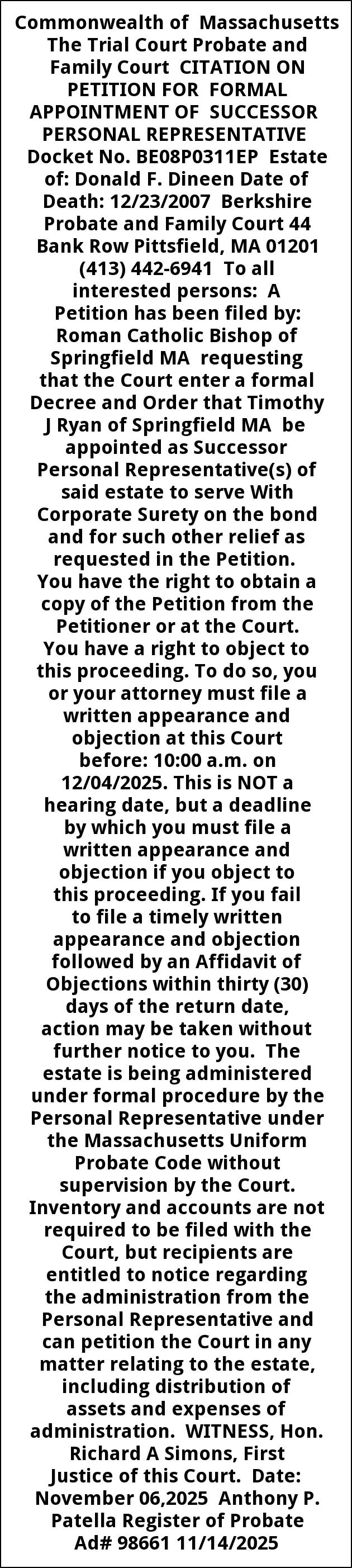 Commonwealth of Massachusetts The Trial Court Probate and Family Court CITATION ON PETITION FOR FORMAL APPOINTMENT OF SUCCESSOR PERSONAL REPRESENTATIVE Docket No. BE08P0311EP Estate of: Donald F. Dineen Date of Death: 12/23/2007 Berkshire Probate and Family Court 44 Bank Row Pittsfield, MA 01201 (413) 442-6941 To all interested persons: A Petition has been filed by: Roman Catholic Bishop of Springfield MA requesting that the Court enter a formal Decree and Order that Timothy J Ryan of Springfield MA be appointed as Successor Personal Representative(s) of said estate to serve With Corporate Surety on the bond and for such other relief as requested in the Petition. You have the right to obtain a copy of the Petition from the Petitioner or at the Court. You have a right to object to this proceeding. To do so, you or your attorney must file a written appearance and objection at this Court before: 10:00 a.m. on 12/04/2025. This is NOT a hearing date, but a deadline by which you must file a written appearance and objection if you object to this proceeding. If you fail to file a timely written appearance and objection followed by an Affidavit of Objections within thirty (30) days of the return date, action may be taken without further notice to you. The estate is being administered under formal procedure by the Personal Representative under the Massachusetts Uniform Probate Code without supervision by the Court. Inventory and accounts are not required to be filed with the Court, but recipients are entitled to notice regarding the administration from the Personal Representative and can petition the Court in any matter relating to the estate, including distribution of assets and expenses of administration. WITNESS, Hon. Richard A Simons, First Justice of this Court. Date: November 06,2025 Anthony P. Patella Register of Probate Ad# 98661 11/14/2025