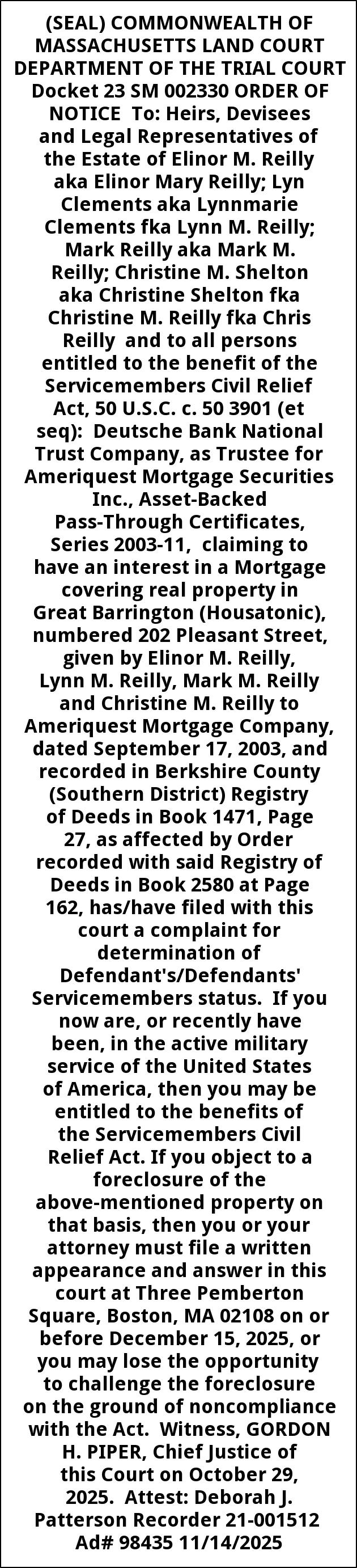 (SEAL) COMMONWEALTH OF MASSACHUSETTS LAND COURT DEPARTMENT OF THE TRIAL COURT Docket 23 SM 002330 ORDER OF NOTICE To: Heirs, Devisees and Legal Representatives of the Estate of Elinor M. Reilly aka Elinor Mary Reilly; Lyn Clements aka Lynnmarie Clements fka Lynn M. Reilly; Mark Reilly aka Mark M. Reilly; Christine M. Shelton aka Christine Shelton fka Christine M. Reilly fka Chris Reilly and to all persons entitled to the benefit of the Servicemembers Civil Relief Act, 50 U.S.C. c. 50 3901 (et seq): Deutsche Bank National Trust Company, as Trustee for Ameriquest Mortgage Securities Inc., Asset-Backed Pass-Through Certificates, Series 2003-11, claiming to have an interest in a Mortgage covering real property in Great Barrington (Housatonic), numbered 202 Pleasant Street, given by Elinor M. Reilly, Lynn M. Reilly, Mark M. Reilly and Christine M. Reilly to Ameriquest Mortgage Company, dated September 17, 2003, and recorded in Berkshire County (Southern District) Registry of Deeds in Book 1471, Page 27, as affected by Order recorded with said Registry of Deeds in Book 2580 at Page 162, has/have filed with this court a complaint for determination of Defendant's/Defendants' Servicemembers status. If you now are, or recently have been, in the active military service of the United States of America, then you may be entitled to the benefits of the Servicemembers Civil Relief Act. If you object to a foreclosure of the above-mentioned property on that basis, then you or your attorney must file a written appearance and answer in this court at Three Pemberton Square, Boston, MA 02108 on or before December 15, 2025, or you may lose the opportunity to challenge the foreclosure on the ground of noncompliance with the Act. Witness, GORDON H. PIPER, Chief Justice of this Court on October 29, 2025. Attest: Deborah J. Patterson Recorder 21-001512 Ad# 98435 11/14/2025