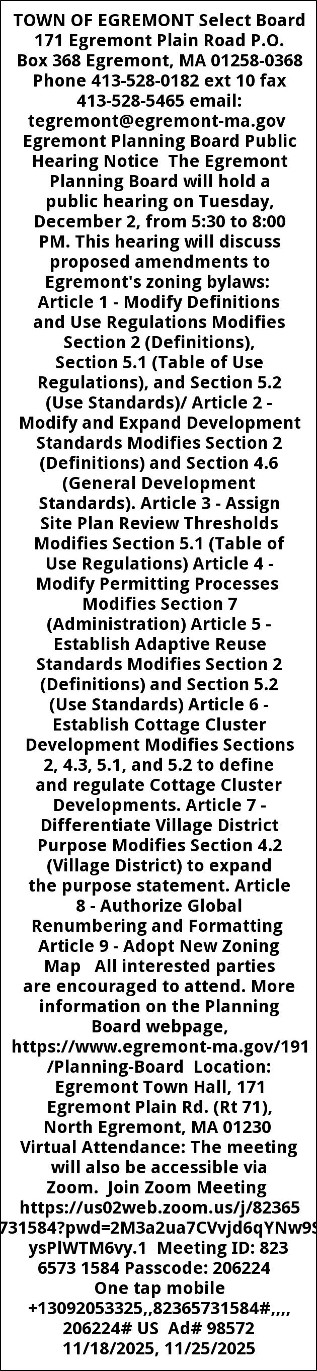 TOWN OF EGREMONT Select Board 171 Egremont Plain Road P.O. Box 368 Egremont, MA 01258-0368 Phone 413-528-0182 ext 10 fax 413-528-5465 email: tegremont@egremont-ma.gov Egremont Planning Board Public Hearing Notice The Egremont Planning Board will hold a public hearing on Tuesday, December 2, from 5:30 to 8:00 PM. This hearing will discuss proposed amendments to Egremont's zoning bylaws: Article 1 - Modify Definitions and Use Regulations Modifies Section 2 (Definitions), Section 5.1 (Table of Use Regulations), and Section 5.2 (Use Standards)/ Article 2 - Modify and Expand Development Standards Modifies Section 2 (Definitions) and Section 4.6 (General Development Standards). Article 3 - Assign Site Plan Review Thresholds Modifies Section 5.1 (Table of Use Regulations) Article 4 - Modify Permitting Processes Modifies Section 7 (Administration) Article 5 - Establish Adaptive Reuse Standards Modifies Section 2 (Definitions) and Section 5.2 (Use Standards) Article 6 - Establish Cottage Cluster Development Modifies Sections 2, 4.3, 5.1, and 5.2 to define and regulate Cottage Cluster Developments. Article 7 - Differentiate Village District Purpose Modifies Section 4.2 (Village District) to expand the purpose statement. Article 8 - Authorize Global Renumbering and Formatting Article 9 - Adopt New Zoning Map All interested parties are encouraged to attend. More information on the Planning Board webpage, https://www.egremont-ma.gov/191/Planning-Board Location: Egremont Town Hall, 171 Egremont Plain Rd. (Rt 71), North Egremont, MA 01230 Virtual Attendance: The meeting will also be accessible via Zoom. Join Zoom Meeting https://us02web.zoom.us/j/82365731584?pwd=2M3a2ua7CVvjd6qYNw9SysPlWTM6vy.1 Meeting ID: 823 6573 1584 Passcode: 206224 One tap mobile +13092053325,,82365731584#,,,, 206224# US Ad# 98572 11/18/2025, 11/25/2025
