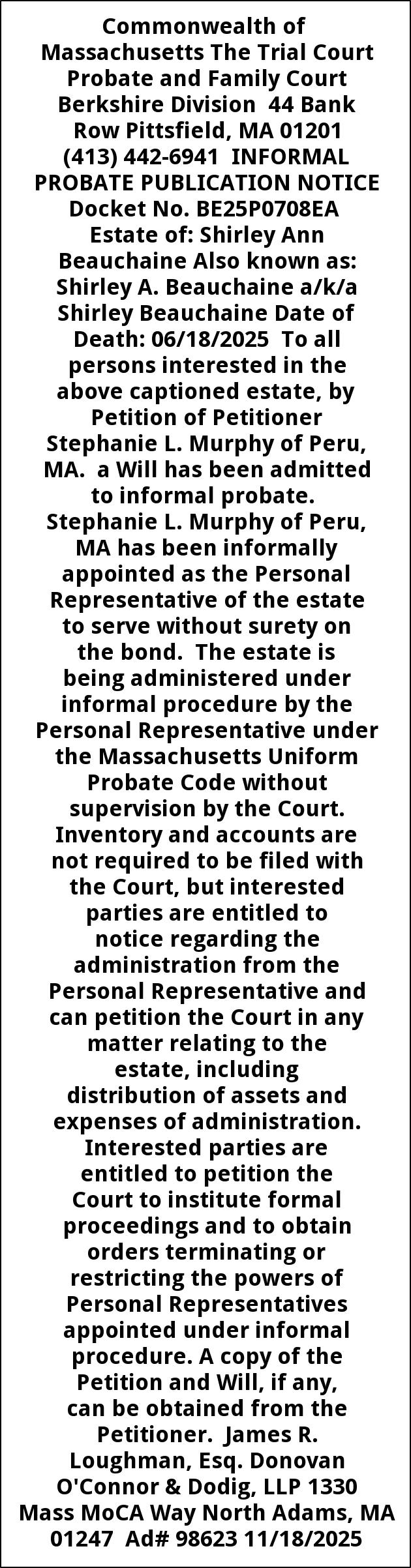 Commonwealth of Massachusetts The Trial Court Probate and Family Court Berkshire Division 44 Bank Row Pittsfield, MA 01201 (413) 442-6941 INFORMAL PROBATE PUBLICATION NOTICE Docket No. BE25P0708EA Estate of: Shirley Ann Beauchaine Also known as: Shirley A. Beauchaine a/k/a Shirley Beauchaine Date of Death: 06/18/2025 To all persons interested in the above captioned estate, by Petition of Petitioner Stephanie L. Murphy of Peru, MA. a Will has been admitted to informal probate. Stephanie L. Murphy of Peru, MA has been informally appointed as the Personal Representative of the estate to serve without surety on the bond. The estate is being administered under informal procedure by the Personal Representative under the Massachusetts Uniform Probate Code without supervision by the Court. Inventory and accounts are not required to be filed with the Court, but interested parties are entitled to notice regarding the administration from the Personal Representative and can petition the Court in any matter relating to the estate, including distribution of assets and expenses of administration. Interested parties are entitled to petition the Court to institute formal proceedings and to obtain orders terminating or restricting the powers of Personal Representatives appointed under informal procedure. A copy of the Petition and Will, if any, can be obtained from the Petitioner. James R. Loughman, Esq. Donovan O'Connor & Dodig, LLP 1330 Mass MoCA Way North Adams, MA 01247 Ad# 98623 11/18/2025
