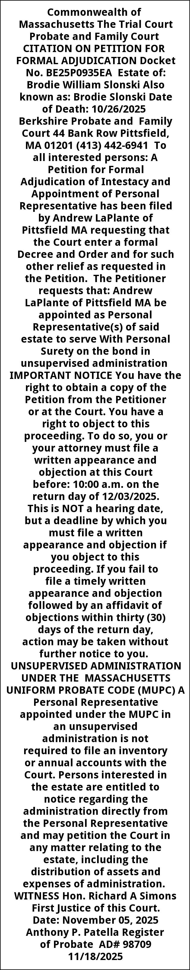 Commonwealth of Massachusetts The Trial Court Probate and Family Court CITATION ON PETITION FOR FORMAL ADJUDICATION Docket No. BE25P0935EA Estate of: Brodie William Slonski Also known as: Brodie Slonski Date of Death: 10/26/2025 Berkshire Probate and Family Court 44 Bank Row Pittsfield, MA 01201 (413) 442-6941 To all interested persons: A Petition for Formal Adjudication of Intestacy and Appointment of Personal Representative has been filed by Andrew LaPlante of Pittsfield MA requesting that the Court enter a formal Decree and Order and for such other relief as requested in the Petition. The Petitioner requests that: Andrew LaPlante of Pittsfield MA be appointed as Personal Representative(s) of said estate to serve With Personal Surety on the bond in unsupervised administration IMPORTANT NOTICE You have the right to obtain a copy of the Petition from the Petitioner or at the Court. You have a right to object to this proceeding. To do so, you or your attorney must file a written appearance and objection at this Court before: 10:00 a.m. on the return day of 12/03/2025. This is NOT a hearing date, but a deadline by which you must file a written appearance and objection if you object to this proceeding. If you fail to file a timely written appearance and objection followed by an affidavit of objections within thirty (30) days of the return day, action may be taken without further notice to you. UNSUPERVISED ADMINISTRATION UNDER THE MASSACHUSETTS UNIFORM PROBATE CODE (MUPC) A Personal Representative appointed under the MUPC in an unsupervised administration is not required to file an inventory or annual accounts with the Court. Persons interested in the estate are entitled to notice regarding the administration directly from the Personal Representative and may petition the Court in any matter relating to the estate, including the distribution of assets and expenses of administration. WITNESS Hon. Richard A Simons First Justice of this Court. Date: November 05, 2025 Anthony P. Patella Register of Probate AD# 98709 11/18/2025