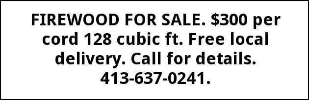 FIREWOOD FOR SALE. $300 per cord 128 cubic ft. Free local delivery. Call for details. 413-637-0241.