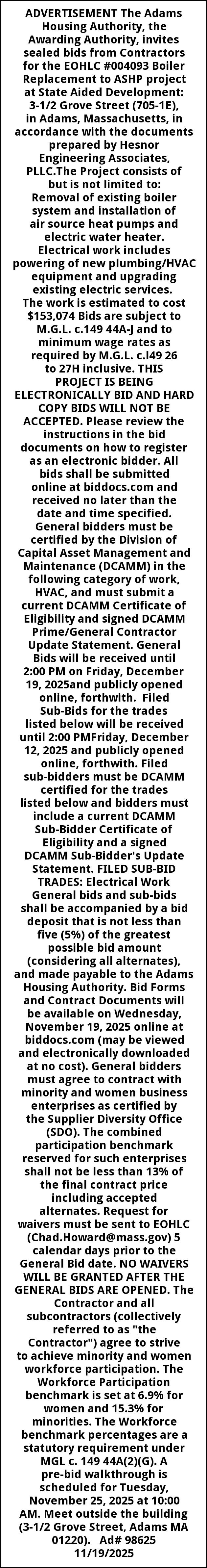 ADVERTISEMENT The Adams Housing Authority, the Awarding Authority, invites sealed bids from Contractors for the EOHLC #004093 Boiler Replacement to ASHP project at State Aided Development: 3-1/2 Grove Street (705-1E), in Adams, Massachusetts, in accordance with the documents prepared by Hesnor Engineering Associates, PLLC.The Project consists of but is not limited to: Removal of existing boiler system and installation of air source heat pumps and electric water heater. Electrical work includes powering of new plumbing/HVAC equipment and upgrading existing electric services. The work is estimated to cost $153,074 Bids are subject to M.G.L. c.149 44A-J and to minimum wage rates as required by M.G.L. c.l49 26 to 27H inclusive. THIS PROJECT IS BEING ELECTRONICALLY BID AND HARD COPY BIDS WILL NOT BE ACCEPTED. Please review the instructions in the bid documents on how to register as an electronic bidder. All bids shall be submitted online at biddocs.com and received no later than the date and time specified. General bidders must be certified by the Division of Capital Asset Management and Maintenance (DCAMM) in the following category of work, HVAC, and must submit a current DCAMM Certificate of Eligibility and signed DCAMM Prime/General Contractor Update Statement. General Bids will be received until 2:00 PM on Friday, December 19, 2025and publicly opened online, forthwith. Filed Sub-Bids for the trades listed below will be received until 2:00 PMFriday, December 12, 2025 and publicly opened online, forthwith. Filed sub-bidders must be DCAMM certified for the trades listed below and bidders must include a current DCAMM Sub-Bidder Certificate of Eligibility and a signed DCAMM Sub-Bidder's Update Statement. FILED SUB-BID TRADES: Electrical Work General bids and sub-bids shall be accompanied by a bid deposit that is not less than five (5%) of the greatest possible bid amount (considering all alternates), and made payable to the Adams Housing Authority. Bid Forms and Contract Documents will be available on Wednesday, November 19, 2025 online at biddocs.com (may be viewed and electronically downloaded at no cost). General bidders must agree to contract with minority and women business enterprises as certified by the Supplier Diversity Office (SDO). The combined participation benchmark reserved for such enterprises shall not be less than 13% of the final contract price including accepted alternates. Request for waivers must be sent to EOHLC (Chad.Howard@mass.gov) 5 calendar days prior to the General Bid date. NO WAIVERS WILL BE GRANTED AFTER THE GENERAL BIDS ARE OPENED. The Contractor and all subcontractors (collectively referred to as "the Contractor") agree to strive to achieve minority and women workforce participation. The Workforce Participation benchmark is set at 6.9% for women and 15.3% for minorities. The Workforce benchmark percentages are a statutory requirement under MGL c. 149 44A(2)(G). A pre-bid walkthrough is scheduled for Tuesday, November 25, 2025 at 10:00 AM. Meet outside the building (3-1/2 Grove Street, Adams MA 01220). Ad# 98625 11/19/2025