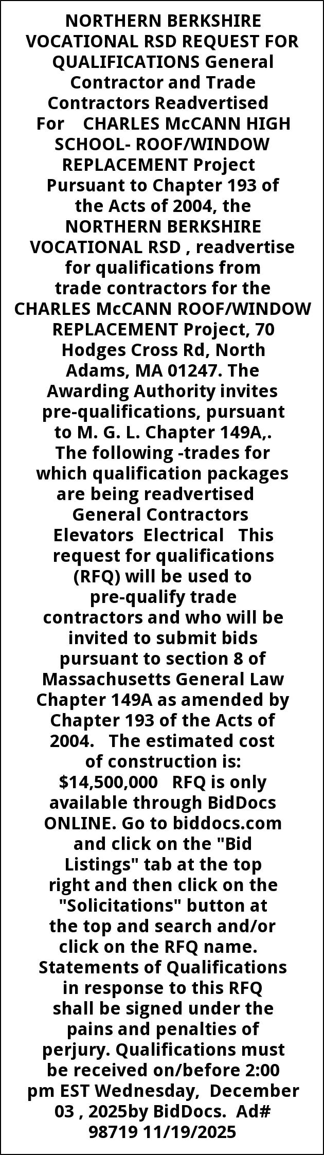 NORTHERN BERKSHIRE VOCATIONAL RSD REQUEST FOR QUALIFICATIONS General Contractor and Trade Contractors Readvertised For CHARLES McCANN HIGH SCHOOL- ROOF/WINDOW REPLACEMENT Project Pursuant to Chapter 193 of the Acts of 2004, the NORTHERN BERKSHIRE VOCATIONAL RSD , readvertise for qualifications from trade contractors for the CHARLES McCANN ROOF/WINDOW REPLACEMENT Project, 70 Hodges Cross Rd, North Adams, MA 01247. The Awarding Authority invites pre-qualifications, pursuant to M. G. L. Chapter 149A,. The following -trades for which qualification packages are being readvertised General Contractors Elevators Electrical This request for qualifications (RFQ) will be used to pre-qualify trade contractors and who will be invited to submit bids pursuant to section 8 of Massachusetts General Law Chapter 149A as amended by Chapter 193 of the Acts of 2004. The estimated cost of construction is: $14,500,000 RFQ is only available through BidDocs ONLINE. Go to biddocs.com and click on the "Bid Listings" tab at the top right and then click on the "Solicitations" button at the top and search and/or click on the RFQ name. Statements of Qualifications in response to this RFQ shall be signed under the pains and penalties of perjury. Qualifications must be received on/before 2:00 pm EST Wednesday, December 03 , 2025by BidDocs. Ad# 98719 11/19/2025