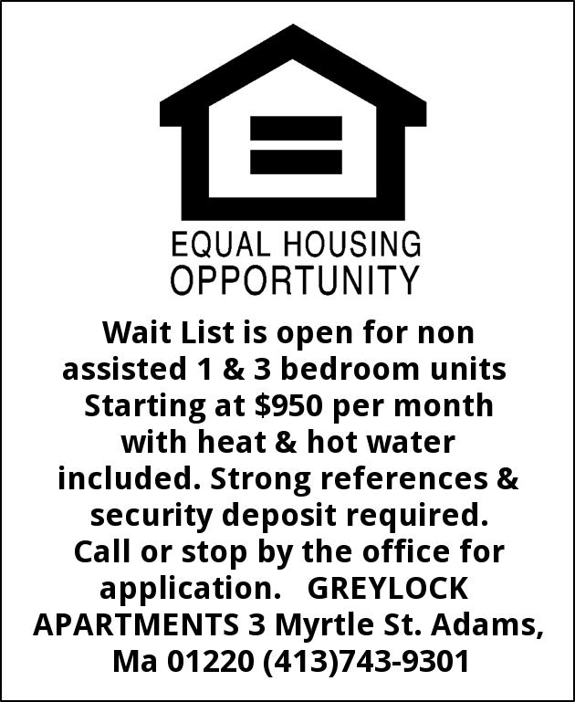 Wait List is open for non assisted 1 & 3 bedroom units Starting at $950 per month with heat & hot water included. Strong references & security deposit required. Call or stop by the office for application. GREYLOCK APARTMENTS 3 Myrtle St. Adams, Ma 01220 (413)743-9301