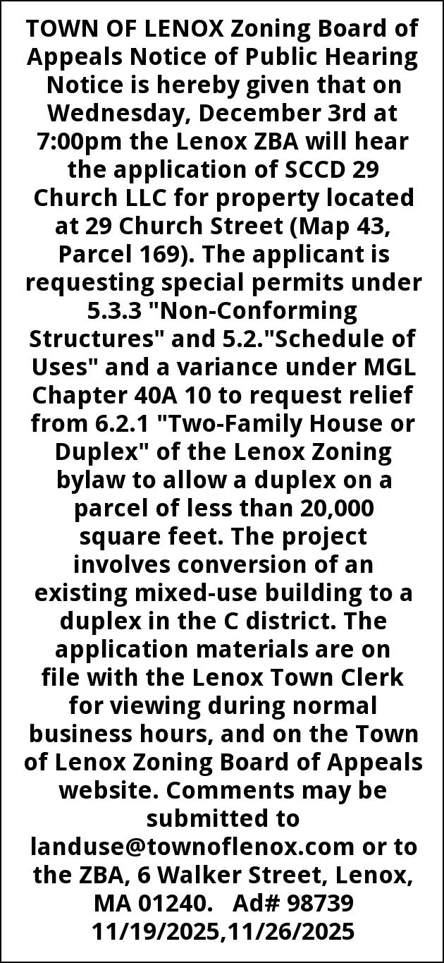 TOWN OF LENOX Zoning Board of Appeals Notice of Public Hearing Notice is hereby given that on Wednesday, December 3rd at 7:00pm the Lenox ZBA will hear the application of SCCD 29 Church LLC for property located at 29 Church Street (Map 43, Parcel 169). The applicant is requesting special permits under 5.3.3 "Non-Conforming Structures" and 5.2."Schedule of Uses" and a variance under MGL Chapter 40A 10 to request relief from 6.2.1 "Two-Family House or Duplex" of the Lenox Zoning bylaw to allow a duplex on a parcel of less than 20,000 square feet. The project involves conversion of an existing mixed-use building to a duplex in the C district. The application materials are on file with the Lenox Town Clerk for viewing during normal business hours, and on the Town of Lenox Zoning Board of Appeals website. Comments may be submitted to landuse@townoflenox.com or to the ZBA, 6 Walker Street, Lenox, MA 01240. Ad# 98739 11/19/2025,11/26/2025