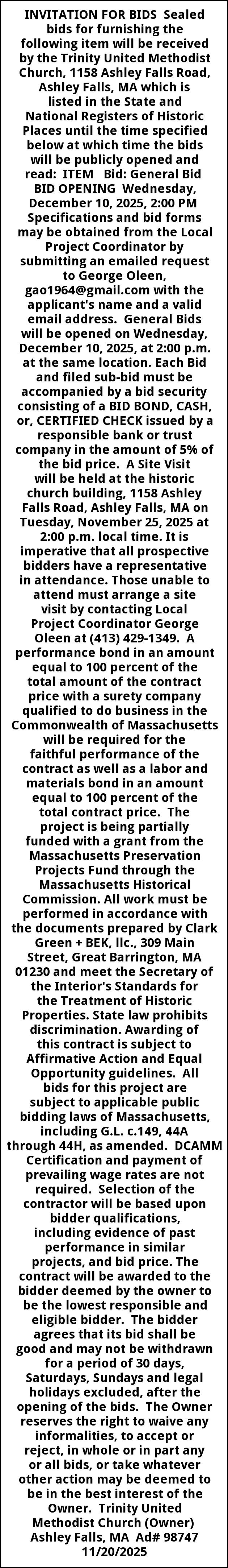 INVITATION FOR BIDS Sealed bids for furnishing the following item will be received by the Trinity United Methodist Church, 1158 Ashley Falls Road, Ashley Falls, MA which is listed in the State and National Registers of Historic Places until the time specified below at which time the bids will be publicly opened and read: ITEM Bid: General Bid BID OPENING Wednesday, December 10, 2025, 2:00 PM Specifications and bid forms may be obtained from the Local Project Coordinator by submitting an emailed request to George Oleen, gao1964@gmail.com with the applicant's name and a valid email address. General Bids will be opened on Wednesday, December 10, 2025, at 2:00 p.m. at the same location. Each Bid and filed sub-bid must be accompanied by a bid security consisting of a BID BOND, CASH, or, CERTIFIED CHECK issued by a responsible bank or trust company in the amount of 5% of the bid price. A Site Visit will be held at the historic church building, 1158 Ashley Falls Road, Ashley Falls, MA on Tuesday, November 25, 2025 at 2:00 p.m. local time. It is imperative that all prospective bidders have a representative in attendance. Those unable to attend must arrange a site visit by contacting Local Project Coordinator George Oleen at (413) 429-1349. A performance bond in an amount equal to 100 percent of the total amount of the contract price with a surety company qualified to do business in the Commonwealth of Massachusetts will be required for the faithful performance of the contract as well as a labor and materials bond in an amount equal to 100 percent of the total contract price. The project is being partially funded with a grant from the Massachusetts Preservation Projects Fund through the Massachusetts Historical Commission. All work must be performed in accordance with the documents prepared by Clark Green + BEK, llc., 309 Main Street, Great Barrington, MA 01230 and meet the Secretary of the Interior's Standards for the Treatment of Historic Properties. State law prohibits discrimination. Awarding of this contract is subject to Affirmative Action and Equal Opportunity guidelines. All bids for this project are subject to applicable public bidding laws of Massachusetts, including G.L. c.149, 44A through 44H, as amended. DCAMM Certification and payment of prevailing wage rates are not required. Selection of the contractor will be based upon bidder qualifications, including evidence of past performance in similar projects, and bid price. The contract will be awarded to the bidder deemed by the owner to be the lowest responsible and eligible bidder. The bidder agrees that its bid shall be good and may not be withdrawn for a period of 30 days, Saturdays, Sundays and legal holidays excluded, after the opening of the bids. The Owner reserves the right to waive any informalities, to accept or reject, in whole or in part any or all bids, or take whatever other action may be deemed to be in the best interest of the Owner. Trinity United Methodist Church (Owner) Ashley Falls, MA Ad# 98747 11/20/2025