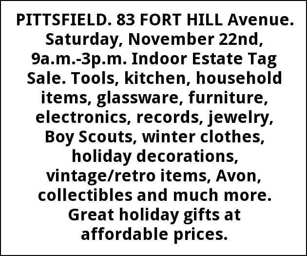 PITTSFIELD. 83 FORT HILL Avenue. Saturday, November 22nd, 9a.m.-3p.m. Indoor Estate Tag Sale. Tools, kitchen, household items, glassware, furniture, electronics, records, jewelry, Boy Scouts, winter clothes, holiday decorations, vintage/retro items, Avon, collectibles and much more. Great holiday gifts at affordable prices.