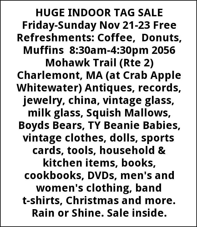 HUGE INDOOR TAG SALE Friday-Sunday Nov 21-23 Free Refreshments: Coffee, Donuts, Muffins 8:30am-4:30pm 2056 Mohawk Trail (Rte 2) Charlemont, MA (at Crab Apple Whitewater) Antiques, records, jewelry, china, vintage glass, milk glass, Squish Mallows, Boyds Bears, TY Beanie Babies, vintage clothes, dolls, sports cards, tools, household & kitchen items, books, cookbooks, DVDs, men's and women's clothing, band t-shirts, Christmas and more. Rain or Shine. Sale inside.