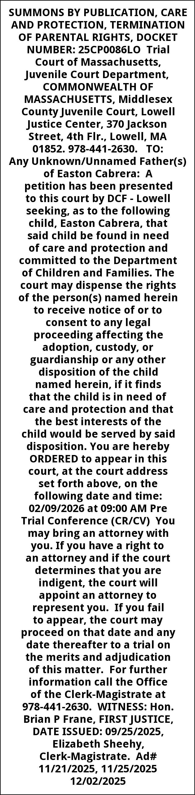 SUMMONS BY PUBLICATION, CARE AND PROTECTION, TERMINATION OF PARENTAL RIGHTS, DOCKET NUMBER: 25CP0086LO Trial Court of Massachusetts, Juvenile Court Department, COMMONWEALTH OF MASSACHUSETTS, Middlesex County Juvenile Court, Lowell Justice Center, 370 Jackson Street, 4th Flr., Lowell, MA 01852. 978-441-2630. TO: Any Unknown/Unnamed Father(s) of Easton Cabrera: A petition has been presented to this court by DCF - Lowell seeking, as to the following child, Easton Cabrera, that said child be found in need of care and protection and committed to the Department of Children and Families. The court may dispense the rights of the person(s) named herein to receive notice of or to consent to any legal proceeding affecting the adoption, custody, or guardianship or any other disposition of the child named herein, if it finds that the child is in need of care and protection and that the best interests of the child would be served by said disposition. You are hereby ORDERED to appear in this court, at the court address set forth above, on the following date and time: 02/09/2026 at 09:00 AM Pre Trial Conference (CR/CV) You may bring an attorney with you. If you have a right to an attorney and if the court determines that you are indigent, the court will appoint an attorney to represent you. If you fail to appear, the court may proceed on that date and any date thereafter to a trial on the merits and adjudication of this matter. For further information call the Office of the Clerk-Magistrate at 978-441-2630. WITNESS: Hon. Brian P Frane, FIRST JUSTICE, DATE ISSUED: 09/25/2025, Elizabeth Sheehy, Clerk-Magistrate. Ad# 11/21/2025, 11/25/2025 12/02/2025