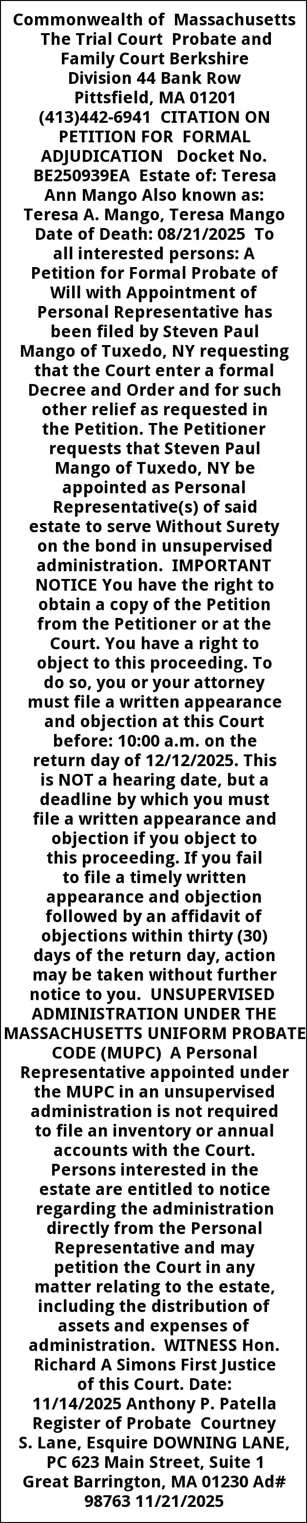 Commonwealth of Massachusetts The Trial Court Probate and Family Court Berkshire Division 44 Bank Row Pittsfield, MA 01201 (413)442-6941 CITATION ON PETITION FOR FORMAL ADJUDICATION Docket No. BE250939EA Estate of: Teresa Ann Mango Also known as: Teresa A. Mango, Teresa Mango Date of Death: 08/21/2025 To all interested persons: A Petition for Formal Probate of Will with Appointment of Personal Representative has been filed by Steven Paul Mango of Tuxedo, NY requesting that the Court enter a formal Decree and Order and for such other relief as requested in the Petition. The Petitioner requests that Steven Paul Mango of Tuxedo, NY be appointed as Personal Representative(s) of said estate to serve Without Surety on the bond in unsupervised administration. IMPORTANT NOTICE You have the right to obtain a copy of the Petition from the Petitioner or at the Court. You have a right to object to this proceeding. To do so, you or your attorney must file a written appearance and objection at this Court before: 10:00 a.m. on the return day of 12/12/2025. This is NOT a hearing date, but a deadline by which you must file a written appearance and objection if you object to this proceeding. If you fail to file a timely written appearance and objection followed by an affidavit of objections within thirty (30) days of the return day, action may be taken without further notice to you. UNSUPERVISED ADMINISTRATION UNDER THE MASSACHUSETTS UNIFORM PROBATE CODE (MUPC) A Personal Representative appointed under the MUPC in an unsupervised administration is not required to file an inventory or annual accounts with the Court. Persons interested in the estate are entitled to notice regarding the administration directly from the Personal Representative and may petition the Court in any matter relating to the estate, including the distribution of assets and expenses of administration. WITNESS Hon. Richard A Simons First Justice of this Court. Date: 11/14/2025 Anthony P. Patella Register of Probate Courtney S. Lane, Esquire DOWNING LANE, PC 623 Main Street, Suite 1 Great Barrington, MA 01230 Ad# 98763 11/21/2025