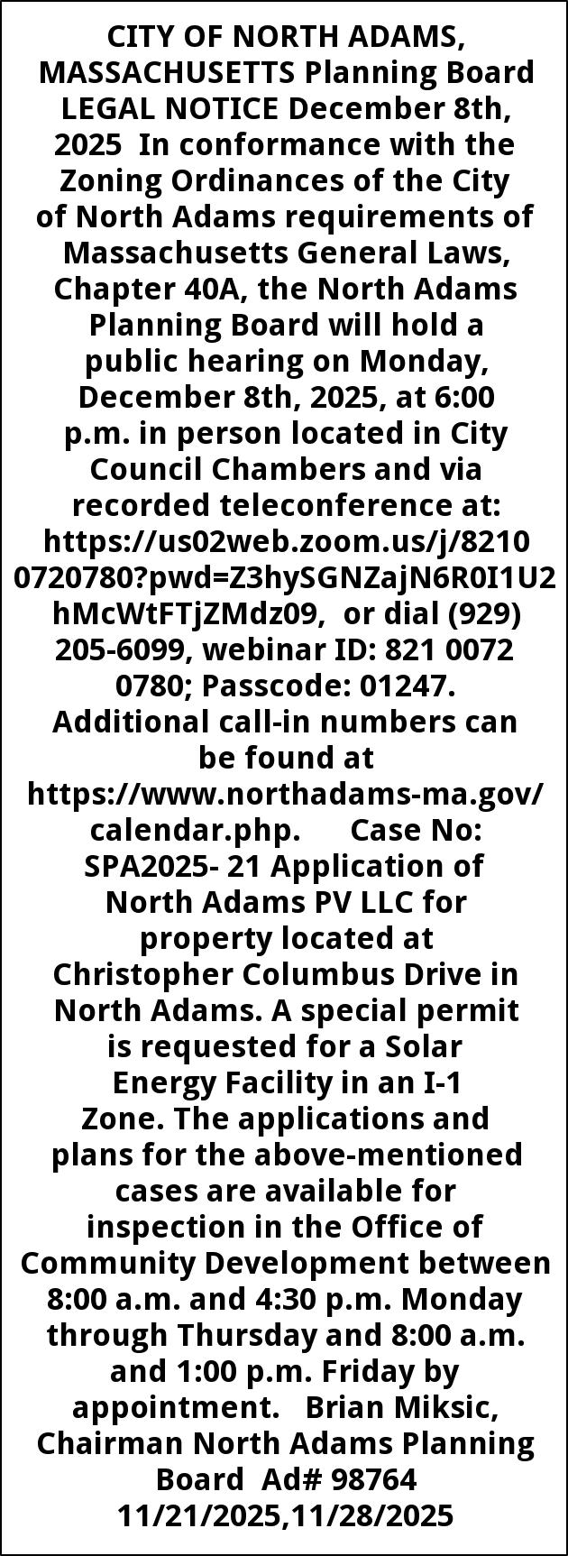 CITY OF NORTH ADAMS, MASSACHUSETTS Planning Board LEGAL NOTICE December 8th, 2025 In conformance with the Zoning Ordinances of the City of North Adams requirements of Massachusetts General Laws, Chapter 40A, the North Adams Planning Board will hold a public hearing on Monday, December 8th, 2025, at 6:00 p.m. in person located in City Council Chambers and via recorded teleconference at: https://us02web.zoom.us/j/82100720780?pwd=Z3hySGNZajN6R0I1U2hMcWtFTjZMdz09, or dial (929) 205-6099, webinar ID: 821 0072 0780; Passcode: 01247. Additional call-in numbers can be found at https://www.northadams-ma.gov/calendar.php. Case No: SPA2025- 21 Application of North Adams PV LLC for property located at Christopher Columbus Drive in North Adams. A special permit is requested for a Solar Energy Facility in an I-1 Zone. The applications and plans for the above-mentioned cases are available for inspection in the Office of Community Development between 8:00 a.m. and 4:30 p.m. Monday through Thursday and 8:00 a.m. and 1:00 p.m. Friday by appointment. Brian Miksic, Chairman North Adams Planning Board Ad# 98764 11/21/2025,11/28/2025