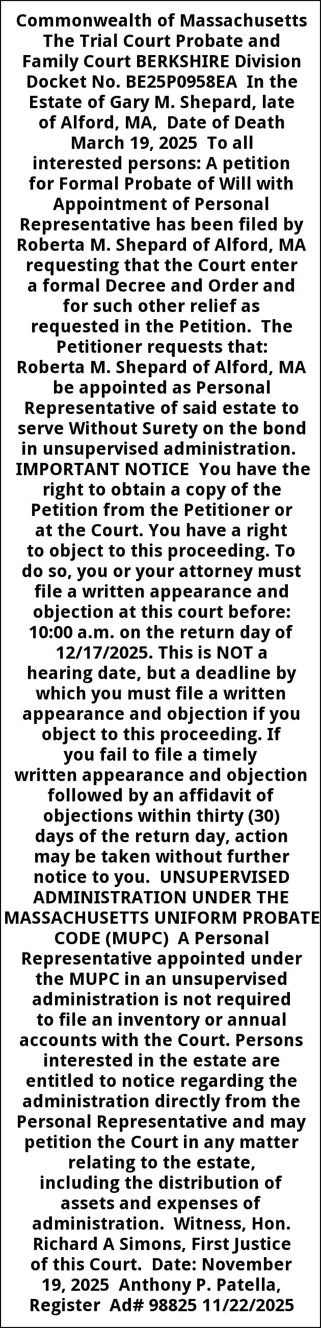 Commonwealth of Massachusetts The Trial Court Probate and Family Court BERKSHIRE Division Docket No. BE25P0958EA In the Estate of Gary M. Shepard, late of Alford, MA, Date of Death March 19, 2025 To all interested persons: A petition for Formal Probate of Will with Appointment of Personal Representative has been filed by Roberta M. Shepard of Alford, MA requesting that the Court enter a formal Decree and Order and for such other relief as requested in the Petition. The Petitioner requests that: Roberta M. Shepard of Alford, MA be appointed as Personal Representative of said estate to serve Without Surety on the bond in unsupervised administration. IMPORTANT NOTICE You have the right to obtain a copy of the Petition from the Petitioner or at the Court. You have a right to object to this proceeding. To do so, you or your attorney must file a written appearance and objection at this court before: 10:00 a.m. on the return day of 12/17/2025. This is NOT a hearing date, but a deadline by which you must file a written appearance and objection if you object to this proceeding. If you fail to file a timely written appearance and objection followed by an affidavit of objections within thirty (30) days of the return day, action may be taken without further notice to you. UNSUPERVISED ADMINISTRATION UNDER THE MASSACHUSETTS UNIFORM PROBATE CODE (MUPC) A Personal Representative appointed under the MUPC in an unsupervised administration is not required to file an inventory or annual accounts with the Court. Persons interested in the estate are entitled to notice regarding the administration directly from the Personal Representative and may petition the Court in any matter relating to the estate, including the distribution of assets and expenses of administration. Witness, Hon. Richard A Simons, First Justice of this Court. Date: November 19, 2025 Anthony P. Patella, Register Ad# 98825 11/22/2025