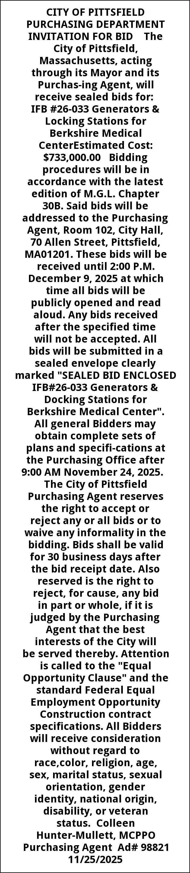 CITY OF PITTSFIELD PURCHASING DEPARTMENT INVITATION FOR BID The City of Pittsfield, Massachusetts, acting through its Mayor and its Purchas-ing Agent, will receive sealed bids for: IFB #26-033 Generators & Locking Stations for Berkshire Medical CenterEstimated Cost: $733,000.00 Bidding procedures will be in accordance with the latest edition of M.G.L. Chapter 30B. Said bids will be addressed to the Purchasing Agent, Room 102, City Hall, 70 Allen Street, Pittsfield, MA01201. These bids will be received until 2:00 P.M. December 9, 2025 at which time all bids will be publicly opened and read aloud. Any bids received after the specified time will not be accepted. All bids will be submitted in a sealed envelope clearly marked "SEALED BID ENCLOSED IFB#26-033 Generators & Docking Stations for Berkshire Medical Center". All general Bidders may obtain complete sets of plans and specifi-cations at the Purchasing Office after 9:00 AM November 24, 2025. The City of Pittsfield Purchasing Agent reserves the right to accept or reject any or all bids or to waive any informality in the bidding. Bids shall be valid for 30 business days after the bid receipt date. Also reserved is the right to reject, for cause, any bid in part or whole, if it is judged by the Purchasing Agent that the best interests of the City will be served thereby. Attention is called to the "Equal Opportunity Clause" and the standard Federal Equal Employment Opportunity Construction contract specifications. All Bidders will receive consideration without regard to race,color, religion, age, sex, marital status, sexual orientation, gender identity, national origin, disability, or veteran status. Colleen Hunter-Mullett, MCPPO Purchasing Agent Ad# 98821 11/25/2025