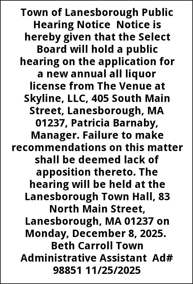 Town of Lanesborough Public Hearing Notice Notice is hereby given that the Select Board will hold a public hearing on the application for a new annual all liquor license from The Venue at Skyline, LLC, 405 South Main Street, Lanesborough, MA 01237, Patricia Barnaby, Manager. Failure to make recommendations on this matter shall be deemed lack of apposition thereto. The hearing will be held at the Lanesborough Town Hall, 83 North Main Street, Lanesborough, MA 01237 on Monday, December 8, 2025. Beth Carroll Town Administrative Assistant Ad# 98851 11/25/2025