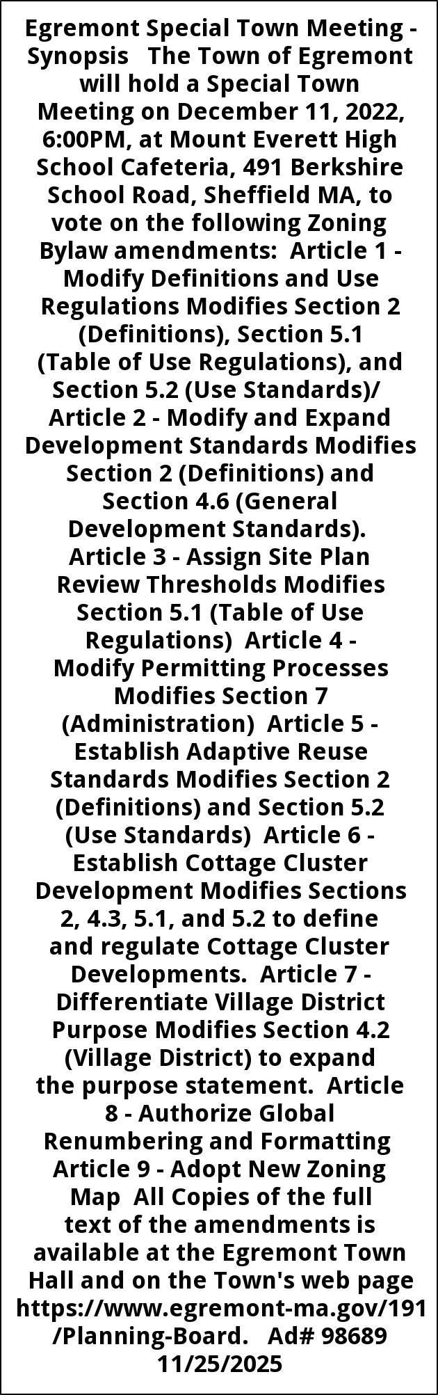 Egremont Special Town Meeting - Synopsis The Town of Egremont will hold a Special Town Meeting on December 11, 2022, 6:00PM, at Mount Everett High School Cafeteria, 491 Berkshire School Road, Sheffield MA, to vote on the following Zoning Bylaw amendments: Article 1 - Modify Definitions and Use Regulations Modifies Section 2 (Definitions), Section 5.1 (Table of Use Regulations), and Section 5.2 (Use Standards)/ Article 2 - Modify and Expand Development Standards Modifies Section 2 (Definitions) and Section 4.6 (General Development Standards). Article 3 - Assign Site Plan Review Thresholds Modifies Section 5.1 (Table of Use Regulations) Article 4 - Modify Permitting Processes Modifies Section 7 (Administration) Article 5 - Establish Adaptive Reuse Standards Modifies Section 2 (Definitions) and Section 5.2 (Use Standards) Article 6 - Establish Cottage Cluster Development Modifies Sections 2, 4.3, 5.1, and 5.2 to define and regulate Cottage Cluster Developments. Article 7 - Differentiate Village District Purpose Modifies Section 4.2 (Village District) to expand the purpose statement. Article 8 - Authorize Global Renumbering and Formatting Article 9 - Adopt New Zoning Map All Copies of the full text of the amendments is available at the Egremont Town Hall and on the Town's web page https://www.egremont-ma.gov/191/Planning-Board. Ad# 98689 11/25/2025