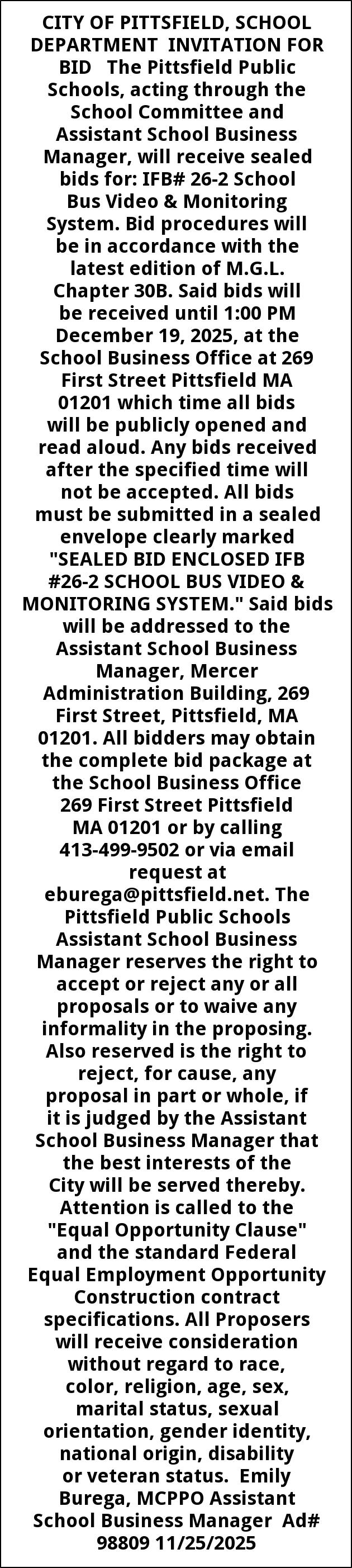 CITY OF PITTSFIELD, SCHOOL DEPARTMENT INVITATION FOR BID The Pittsfield Public Schools, acting through the School Committee and Assistant School Business Manager, will receive sealed bids for: IFB# 26-2 School Bus Video & Monitoring System. Bid procedures will be in accordance with the latest edition of M.G.L. Chapter 30B. Said bids will be received until 1:00 PM December 19, 2025, at the School Business Office at 269 First Street Pittsfield MA 01201 which time all bids will be publicly opened and read aloud. Any bids received after the specified time will not be accepted. All bids must be submitted in a sealed envelope clearly marked "SEALED BID ENCLOSED IFB #26-2 SCHOOL BUS VIDEO & MONITORING SYSTEM." Said bids will be addressed to the Assistant School Business Manager, Mercer Administration Building, 269 First Street, Pittsfield, MA 01201. All bidders may obtain the complete bid package at the School Business Office 269 First Street Pittsfield MA 01201 or by calling 413-499-9502 or via email request at eburega@pittsfield.net. The Pittsfield Public Schools Assistant School Business Manager reserves the right to accept or reject any or all proposals or to waive any informality in the proposing. Also reserved is the right to reject, for cause, any proposal in part or whole, if it is judged by the Assistant School Business Manager that the best interests of the City will be served thereby. Attention is called to the "Equal Opportunity Clause" and the standard Federal Equal Employment Opportunity Construction contract specifications. All Proposers will receive consideration without regard to race, color, religion, age, sex, marital status, sexual orientation, gender identity, national origin, disability or veteran status. Emily Burega, MCPPO Assistant School Business Manager Ad# 98809 11/25/2025