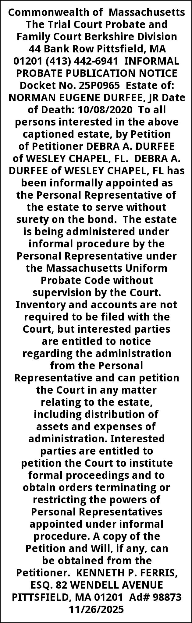 Commonwealth of Massachusetts The Trial Court Probate and Family Court Berkshire Division 44 Bank Row Pittsfield, MA 01201 (413) 442-6941 INFORMAL PROBATE PUBLICATION NOTICE Docket No. 25P0965 Estate of: NORMAN EUGENE DURFEE, JR Date of Death: 10/08/2020 To all persons interested in the above captioned estate, by Petition of Petitioner DEBRA A. DURFEE of WESLEY CHAPEL, FL. DEBRA A. DURFEE of WESLEY CHAPEL, FL has been informally appointed as the Personal Representative of the estate to serve without surety on the bond. The estate is being administered under informal procedure by the Personal Representative under the Massachusetts Uniform Probate Code without supervision by the Court. Inventory and accounts are not required to be filed with the Court, but interested parties are entitled to notice regarding the administration from the Personal Representative and can petition the Court in any matter relating to the estate, including distribution of assets and expenses of administration. Interested parties are entitled to petition the Court to institute formal proceedings and to obtain orders terminating or restricting the powers of Personal Representatives appointed under informal procedure. A copy of the Petition and Will, if any, can be obtained from the Petitioner. KENNETH P. FERRIS, ESQ. 82 WENDELL AVENUE PITTSFIELD, MA 01201 Ad# 98873 11/26/2025
