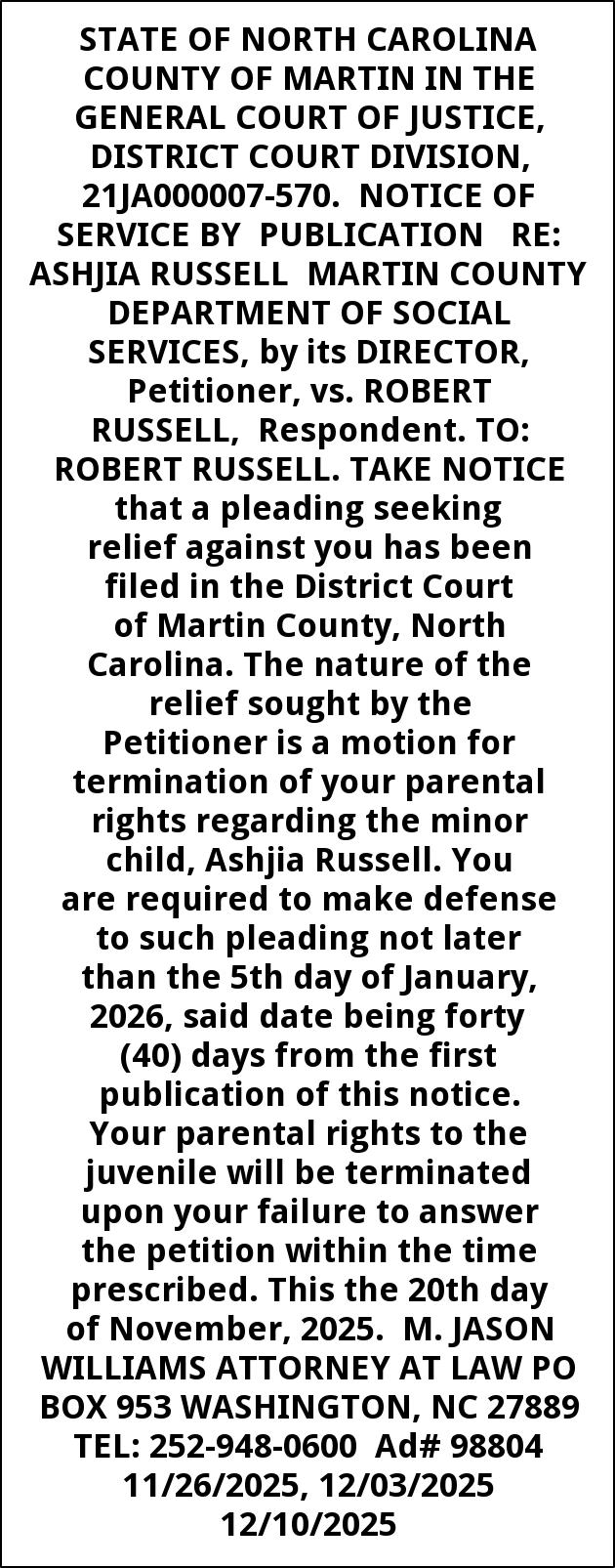 STATE OF NORTH CAROLINA COUNTY OF MARTIN IN THE GENERAL COURT OF JUSTICE, DISTRICT COURT DIVISION, 21JA000007-570. NOTICE OF SERVICE BY PUBLICATION RE: ASHJIA RUSSELL MARTIN COUNTY DEPARTMENT OF SOCIAL SERVICES, by its DIRECTOR, Petitioner, vs. ROBERT RUSSELL, Respondent. TO: ROBERT RUSSELL. TAKE NOTICE that a pleading seeking relief against you has been filed in the District Court of Martin County, North Carolina. The nature of the relief sought by the Petitioner is a motion for termination of your parental rights regarding the minor child, Ashjia Russell. You are required to make defense to such pleading not later than the 5th day of January, 2026, said date being forty (40) days from the first publication of this notice. Your parental rights to the juvenile will be terminated upon your failure to answer the petition within the time prescribed. This the 20th day of November, 2025. M. JASON WILLIAMS ATTORNEY AT LAW PO BOX 953 WASHINGTON, NC 27889 TEL: 252-948-0600 Ad# 98804 11/26/2025, 12/03/2025 12/10/2025