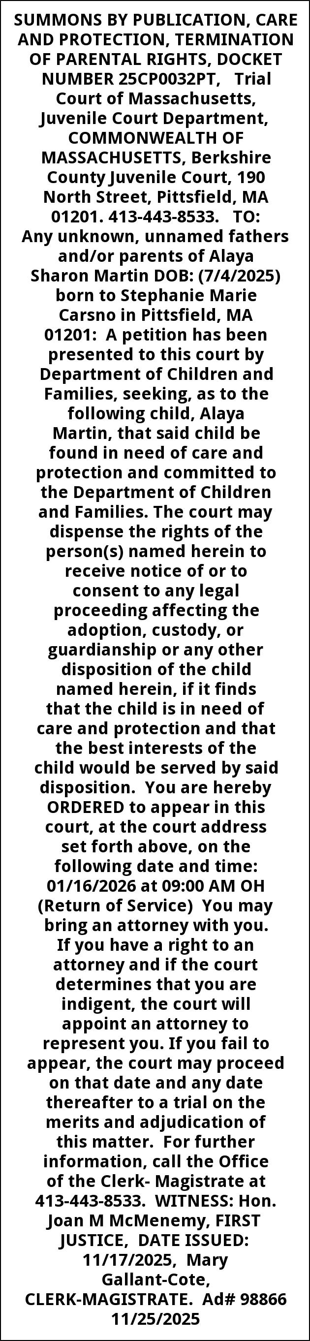 SUMMONS BY PUBLICATION, CARE AND PROTECTION, TERMINATION OF PARENTAL RIGHTS, DOCKET NUMBER 25CP0032PT, Trial Court of Massachusetts, Juvenile Court Department, COMMONWEALTH OF MASSACHUSETTS, Berkshire County Juvenile Court, 190 North Street, Pittsfield, MA 01201. 413-443-8533. TO: Any unknown, unnamed fathers and/or parents of Alaya Sharon Martin DOB: (7/4/2025) born to Stephanie Marie Carsno in Pittsfield, MA 01201: A petition has been presented to this court by Department of Children and Families, seeking, as to the following child, Alaya Martin, that said child be found in need of care and protection and committed to the Department of Children and Families. The court may dispense the rights of the person(s) named herein to receive notice of or to consent to any legal proceeding affecting the adoption, custody, or guardianship or any other disposition of the child named herein, if it finds that the child is in need of care and protection and that the best interests of the child would be served by said disposition. You are hereby ORDERED to appear in this court, at the court address set forth above, on the following date and time: 01/16/2026 at 09:00 AM OH (Return of Service) You may bring an attorney with you. If you have a right to an attorney and if the court determines that you are indigent, the court will appoint an attorney to represent you. If you fail to appear, the court may proceed on that date and any date thereafter to a trial on the merits and adjudication of this matter. For further information, call the Office of the Clerk- Magistrate at 413-443-8533. WITNESS: Hon. Joan M McMenemy, FIRST JUSTICE, DATE ISSUED: 11/17/2025, Mary Gallant-Cote, CLERK-MAGISTRATE. Ad# 98866 11/25/2025