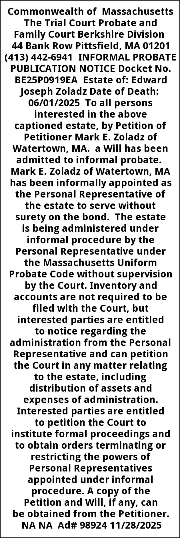 Commonwealth of Massachusetts The Trial Court Probate and Family Court Berkshire Division 44 Bank Row Pittsfield, MA 01201 (413) 442-6941 INFORMAL PROBATE PUBLICATION NOTICE Docket No. BE25P0919EA Estate of: Edward Joseph Zoladz Date of Death: 06/01/2025 To all persons interested in the above captioned estate, by Petition of Petitioner Mark E. Zoladz of Watertown, MA. a Will has been admitted to informal probate. Mark E. Zoladz of Watertown, MA has been informally appointed as the Personal Representative of the estate to serve without surety on the bond. The estate is being administered under informal procedure by the Personal Representative under the Massachusetts Uniform Probate Code without supervision by the Court. Inventory and accounts are not required to be filed with the Court, but interested parties are entitled to notice regarding the administration from the Personal Representative and can petition the Court in any matter relating to the estate, including distribution of assets and expenses of administration. Interested parties are entitled to petition the Court to institute formal proceedings and to obtain orders terminating or restricting the powers of Personal Representatives appointed under informal procedure. A copy of the Petition and Will, if any, can be obtained from the Petitioner. NA NA Ad# 98924 11/28/2025