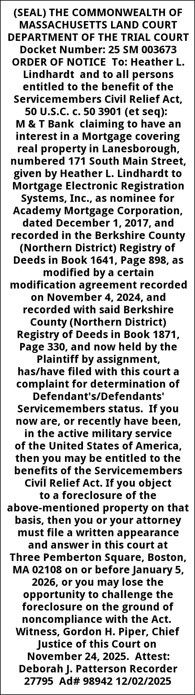 (SEAL) THE COMMONWEALTH OF MASSACHUSETTS LAND COURT DEPARTMENT OF THE TRIAL COURT Docket Number: 25 SM 003673 ORDER OF NOTICE To: Heather L. Lindhardt and to all persons entitled to the benefit of the Servicemembers Civil Relief Act, 50 U.S.C. c. 50 3901 (et seq): M & T Bank claiming to have an interest in a Mortgage covering real property in Lanesborough, numbered 171 South Main Street, given by Heather L. Lindhardt to Mortgage Electronic Registration Systems, Inc., as nominee for Academy Mortgage Corporation, dated December 1, 2017, and recorded in the Berkshire County (Northern District) Registry of Deeds in Book 1641, Page 898, as modified by a certain modification agreement recorded on November 4, 2024, and recorded with said Berkshire County (Northern District) Registry of Deeds in Book 1871, Page 330, and now held by the Plaintiff by assignment, has/have filed with this court a complaint for determination of Defendant's/Defendants' Servicemembers status. If you now are, or recently have been, in the active military service of the United States of America, then you may be entitled to the benefits of the Servicemembers Civil Relief Act. If you object to a foreclosure of the above-mentioned property on that basis, then you or your attorney must file a written appearance and answer in this court at Three Pemberton Square, Boston, MA 02108 on or before January 5, 2026, or you may lose the opportunity to challenge the foreclosure on the ground of noncompliance with the Act. Witness, Gordon H. Piper, Chief Justice of this Court on November 24, 2025. Attest: Deborah J. Patterson Recorder 27795 Ad# 98942 12/02/2025