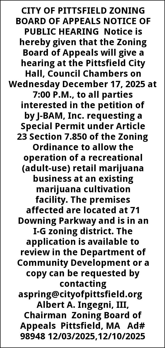 CITY OF PITTSFIELD ZONING BOARD OF APPEALS NOTICE OF PUBLIC HEARING Notice is hereby given that the Zoning Board of Appeals will give a hearing at the Pittsfield City Hall, Council Chambers on Wednesday December 17, 2025 at 7:00 P.M., to all parties interested in the petition of by J-BAM, Inc. requesting a Special Permit under Article 23 Section 7.850 of the Zoning Ordinance to allow the operation of a recreational (adult-use) retail marijuana business at an existing marijuana cultivation facility. The premises affected are located at 71 Downing Parkway and is in an I-G zoning district. The application is available to review in the Department of Community Development or a copy can be requested by contacting aspring@cityofpittsfield.org Albert A. Ingegni, III, Chairman Zoning Board of Appeals Pittsfield, MA Ad# 98948 12/03/2025,12/10/2025