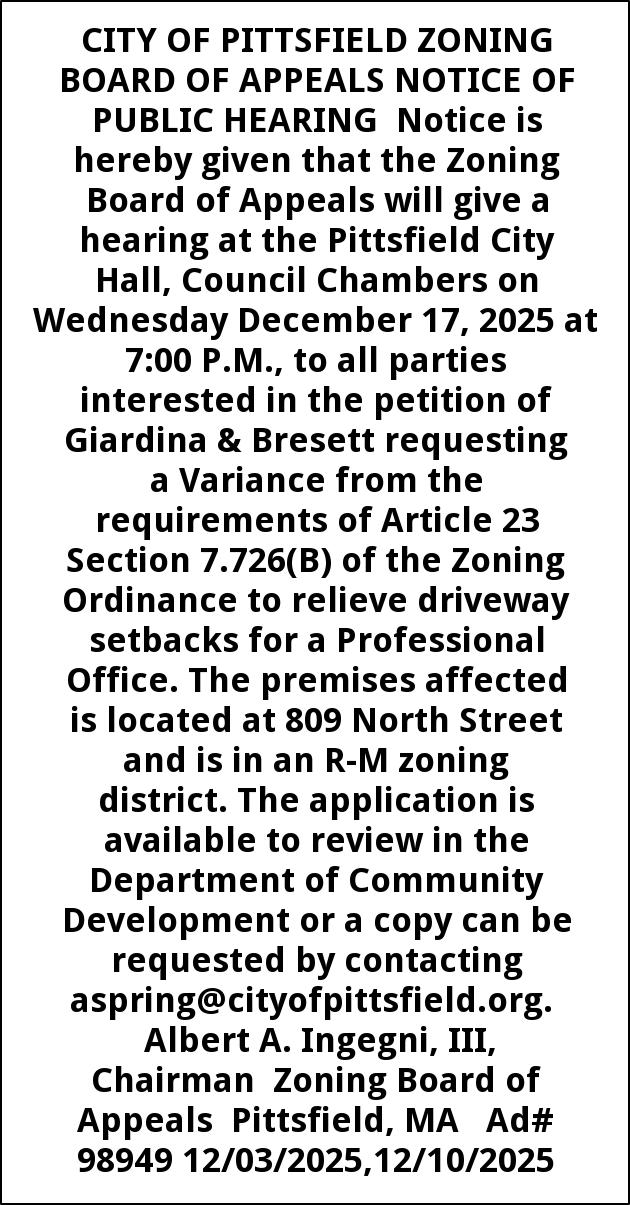 CITY OF PITTSFIELD ZONING BOARD OF APPEALS NOTICE OF PUBLIC HEARING Notice is hereby given that the Zoning Board of Appeals will give a hearing at the Pittsfield City Hall, Council Chambers on Wednesday December 17, 2025 at 7:00 P.M., to all parties interested in the petition of Giardina & Bresett requesting a Variance from the requirements of Article 23 Section 7.726(B) of the Zoning Ordinance to relieve driveway setbacks for a Professional Office. The premises affected is located at 809 North Street and is in an R-M zoning district. The application is available to review in the Department of Community Development or a copy can be requested by contacting aspring@cityofpittsfield.org. Albert A. Ingegni, III, Chairman Zoning Board of Appeals Pittsfield, MA Ad# 98949 12/03/2025,12/10/2025