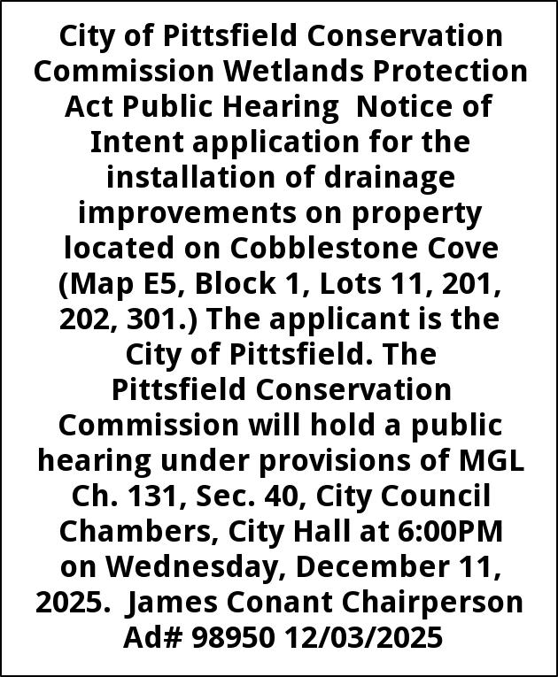 City of Pittsfield Conservation Commission Wetlands Protection Act Public Hearing Notice of Intent application for the installation of drainage improvements on property located on Cobblestone Cove (Map E5, Block 1, Lots 11, 201, 202, 301.) The applicant is the City of Pittsfield. The Pittsfield Conservation Commission will hold a public hearing under provisions of MGL Ch. 131, Sec. 40, City Council Chambers, City Hall at 6:00PM on Wednesday, December 11, 2025. James Conant Chairperson Ad# 98950 12/03/2025