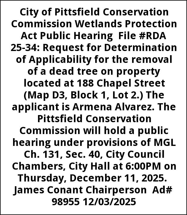 City of Pittsfield Conservation Commission Wetlands Protection Act Public Hearing File #RDA 25-34: Request for Determination of Applicability for the removal of a dead tree on property located at 188 Chapel Street (Map D3, Block 1, Lot 2.) The applicant is Armena Alvarez. The Pittsfield Conservation Commission will hold a public hearing under provisions of MGL Ch. 131, Sec. 40, City Council Chambers, City Hall at 6:00PM on Thursday, December 11, 2025. James Conant Chairperson Ad# 98955 12/03/2025