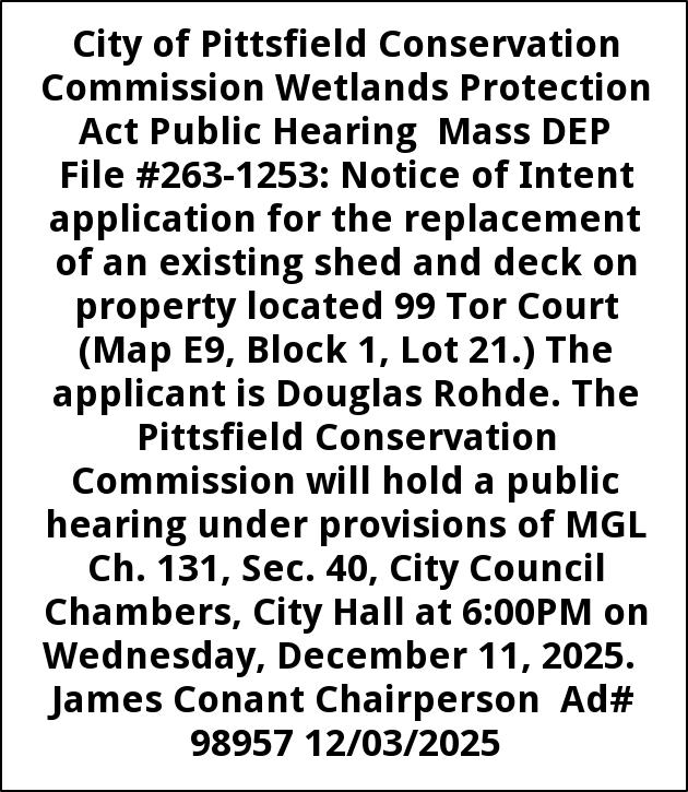 City of Pittsfield Conservation Commission Wetlands Protection Act Public Hearing Mass DEP File #263-1253: Notice of Intent application for the replacement of an existing shed and deck on property located 99 Tor Court (Map E9, Block 1, Lot 21.) The applicant is Douglas Rohde. The Pittsfield Conservation Commission will hold a public hearing under provisions of MGL Ch. 131, Sec. 40, City Council Chambers, City Hall at 6:00PM on Wednesday, December 11, 2025. James Conant Chairperson Ad# 98957 12/03/2025