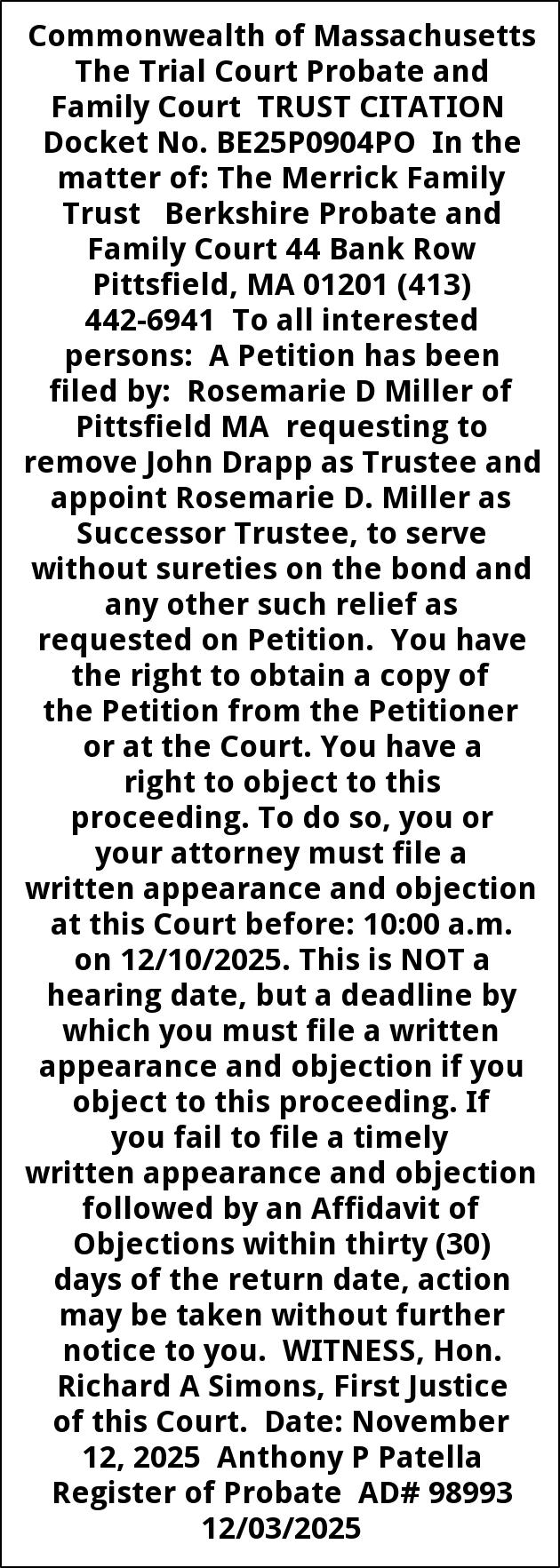 Commonwealth of Massachusetts The Trial Court Probate and Family Court TRUST CITATION Docket No. BE25P0904PO In the matter of: The Merrick Family Trust Berkshire Probate and Family Court 44 Bank Row Pittsfield, MA 01201 (413) 442-6941 To all interested persons: A Petition has been filed by: Rosemarie D Miller of Pittsfield MA requesting to remove John Drapp as Trustee and appoint Rosemarie D. Miller as Successor Trustee, to serve without sureties on the bond and any other such relief as requested on Petition. You have the right to obtain a copy of the Petition from the Petitioner or at the Court. You have a right to object to this proceeding. To do so, you or your attorney must file a written appearance and objection at this Court before: 10:00 a.m. on 12/10/2025. This is NOT a hearing date, but a deadline by which you must file a written appearance and objection if you object to this proceeding. If you fail to file a timely written appearance and objection followed by an Affidavit of Objections within thirty (30) days of the return date, action may be taken without further notice to you. WITNESS, Hon. Richard A Simons, First Justice of this Court. Date: November 12, 2025 Anthony P Patella Register of Probate AD# 98993 12/03/2025