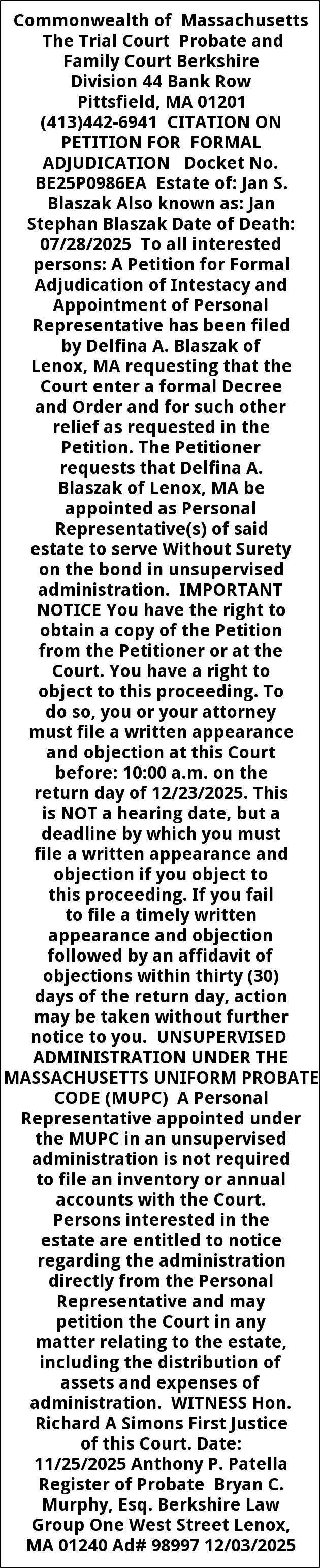 Commonwealth of Massachusetts The Trial Court Probate and Family Court Berkshire Division 44 Bank Row Pittsfield, MA 01201 (413)442-6941 CITATION ON PETITION FOR FORMAL ADJUDICATION Docket No. BE25P0986EA Estate of: Jan S. Blaszak Also known as: Jan Stephan Blaszak Date of Death: 07/28/2025 To all interested persons: A Petition for Formal Adjudication of Intestacy and Appointment of Personal Representative has been filed by Delfina A. Blaszak of Lenox, MA requesting that the Court enter a formal Decree and Order and for such other relief as requested in the Petition. The Petitioner requests that Delfina A. Blaszak of Lenox, MA be appointed as Personal Representative(s) of said estate to serve Without Surety on the bond in unsupervised administration. IMPORTANT NOTICE You have the right to obtain a copy of the Petition from the Petitioner or at the Court. You have a right to object to this proceeding. To do so, you or your attorney must file a written appearance and objection at this Court before: 10:00 a.m. on the return day of 12/23/2025. This is NOT a hearing date, but a deadline by which you must file a written appearance and objection if you object to this proceeding. If you fail to file a timely written appearance and objection followed by an affidavit of objections within thirty (30) days of the return day, action may be taken without further notice to you. UNSUPERVISED ADMINISTRATION UNDER THE MASSACHUSETTS UNIFORM PROBATE CODE (MUPC) A Personal Representative appointed under the MUPC in an unsupervised administration is not required to file an inventory or annual accounts with the Court. Persons interested in the estate are entitled to notice regarding the administration directly from the Personal Representative and may petition the Court in any matter relating to the estate, including the distribution of assets and expenses of administration. WITNESS Hon. Richard A Simons First Justice of this Court. Date: 11/25/2025 Anthony P. Patella Register of Probate Bryan C. Murphy, Esq. Berkshire Law Group One West Street Lenox, MA 01240 Ad# 98997 12/03/2025