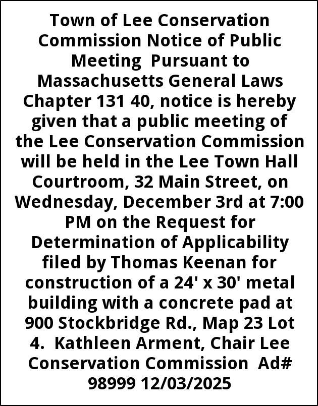 Town of Lee Conservation Commission Notice of Public Meeting Pursuant to Massachusetts General Laws Chapter 131 40, notice is hereby given that a public meeting of the Lee Conservation Commission will be held in the Lee Town Hall Courtroom, 32 Main Street, on Wednesday, December 3rd at 7:00 PM on the Request for Determination of Applicability filed by Thomas Keenan for construction of a 24' x 30' metal building with a concrete pad at 900 Stockbridge Rd., Map 23 Lot 4. Kathleen Arment, Chair Lee Conservation Commission Ad# 98999 12/03/2025