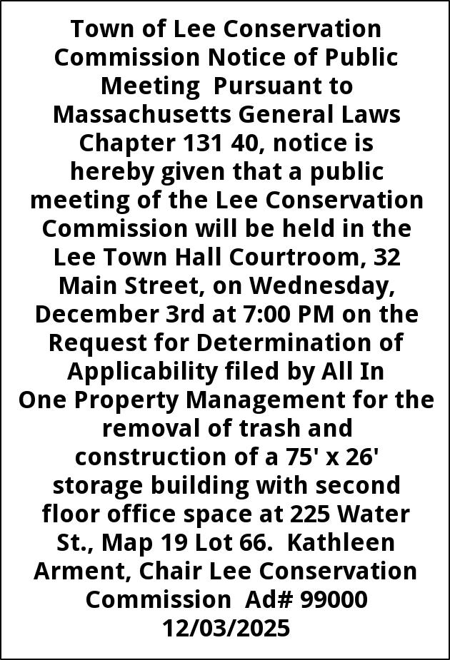 Town of Lee Conservation Commission Notice of Public Meeting Pursuant to Massachusetts General Laws Chapter 131 40, notice is hereby given that a public meeting of the Lee Conservation Commission will be held in the Lee Town Hall Courtroom, 32 Main Street, on Wednesday, December 3rd at 7:00 PM on the Request for Determination of Applicability filed by All In One Property Management for the removal of trash and construction of a 75' x 26' storage building with second floor office space at 225 Water St., Map 19 Lot 66. Kathleen Arment, Chair Lee Conservation Commission Ad# 99000 12/03/2025