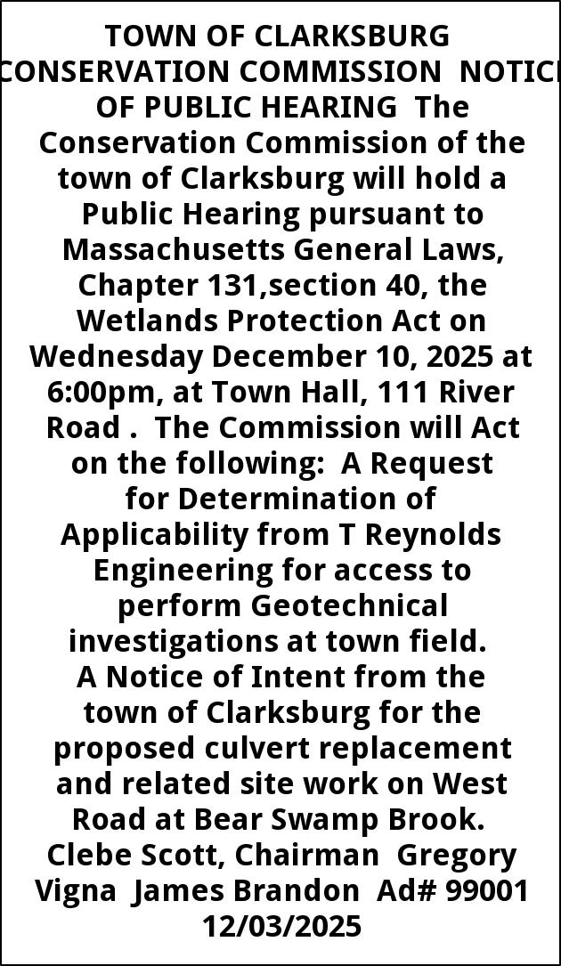 TOWN OF CLARKSBURG CONSERVATION COMMISSION NOTICE OF PUBLIC HEARING The Conservation Commission of the town of Clarksburg will hold a Public Hearing pursuant to Massachusetts General Laws, Chapter 131,section 40, the Wetlands Protection Act on Wednesday December 10, 2025 at 6:00pm, at Town Hall, 111 River Road . The Commission will Act on the following: A Request for Determination of Applicability from T Reynolds Engineering for access to perform Geotechnical investigations at town field. A Notice of Intent from the town of Clarksburg for the proposed culvert replacement and related site work on West Road at Bear Swamp Brook. Clebe Scott, Chairman Gregory Vigna James Brandon Ad# 99001 12/03/2025