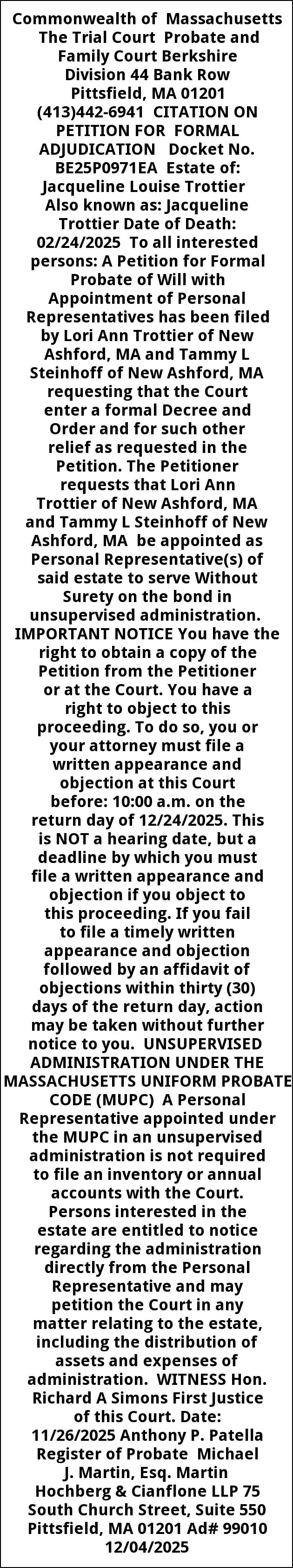 Commonwealth of Massachusetts The Trial Court Probate and Family Court Berkshire Division 44 Bank Row Pittsfield, MA 01201 (413)442-6941 CITATION ON PETITION FOR FORMAL ADJUDICATION Docket No. BE25P0971EA Estate of: Jacqueline Louise Trottier Also known as: Jacqueline Trottier Date of Death: 02/24/2025 To all interested persons: A Petition for Formal Probate of Will with Appointment of Personal Representatives has been filed by Lori Ann Trottier of New Ashford, MA and Tammy L Steinhoff of New Ashford, MA requesting that the Court enter a formal Decree and Order and for such other relief as requested in the Petition. The Petitioner requests that Lori Ann Trottier of New Ashford, MA and Tammy L Steinhoff of New Ashford, MA be appointed as Personal Representative(s) of said estate to serve Without Surety on the bond in unsupervised administration. IMPORTANT NOTICE You have the right to obtain a copy of the Petition from the Petitioner or at the Court. You have a right to object to this proceeding. To do so, you or your attorney must file a written appearance and objection at this Court before: 10:00 a.m. on the return day of 12/24/2025. This is NOT a hearing date, but a deadline by which you must file a written appearance and objection if you object to this proceeding. If you fail to file a timely written appearance and objection followed by an affidavit of objections within thirty (30) days of the return day, action may be taken without further notice to you. UNSUPERVISED ADMINISTRATION UNDER THE MASSACHUSETTS UNIFORM PROBATE CODE (MUPC) A Personal Representative appointed under the MUPC in an unsupervised administration is not required to file an inventory or annual accounts with the Court. Persons interested in the estate are entitled to notice regarding the administration directly from the Personal Representative and may petition the Court in any matter relating to the estate, including the distribution of assets and expenses of administration. WITNESS Hon. Richard A Simons First Justice of this Court. Date: 11/26/2025 Anthony P. Patella Register of Probate Michael J. Martin, Esq. Martin Hochberg & Cianflone LLP 75 South Church Street, Suite 550 Pittsfield, MA 01201 Ad# 99010 12/04/2025