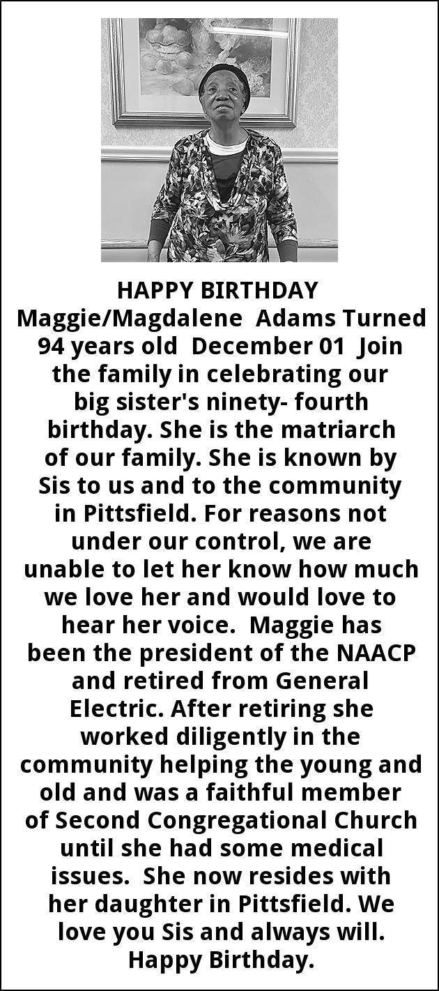 HAPPY BIRTHDAY Maggie/Magdalene Adams Turned 94 years old December 01 Join the family in celebrating our big sister's ninety- fourth birthday. She is the matriarch of our family. She is known by Sis to us and to the community in Pittsfield. For reasons not under our control, we are unable to let her know how much we love her and would love to hear her voice. Maggie has been the president of the NAACP and retired from General Electric. After retiring she worked diligently in the community helping the young and old and was a faithful member of Second Congregational Church until she had some medical issues. She now resides with her daughter in Pittsfield. We love you Sis and always will. Happy Birthday.