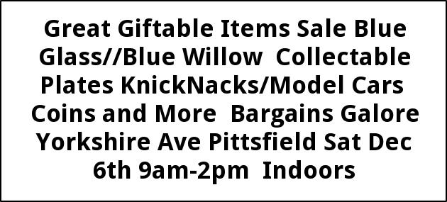 Great Giftable Items Sale Blue Glass//Blue Willow Collectable Plates KnickNacks/Model Cars Coins and More Bargains Galore Yorkshire Ave Pittsfield Sat Dec 6th 9am-2pm Indoors