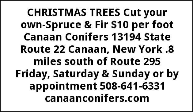 CHRISTMAS TREES Cut your own-Spruce & Fir $10 per foot Canaan Conifers 13194 State Route 22 Canaan, New York .8 miles south of Route 295 Friday, Saturday & Sunday or by appointment 508-641-6331 canaanconifers.com