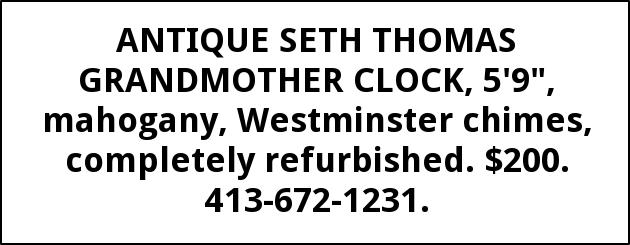 ANTIQUE SETH THOMAS GRANDMOTHER CLOCK, 5'9", mahogany, Westminster chimes, completely refurbished. $200. 413-672-1231.
