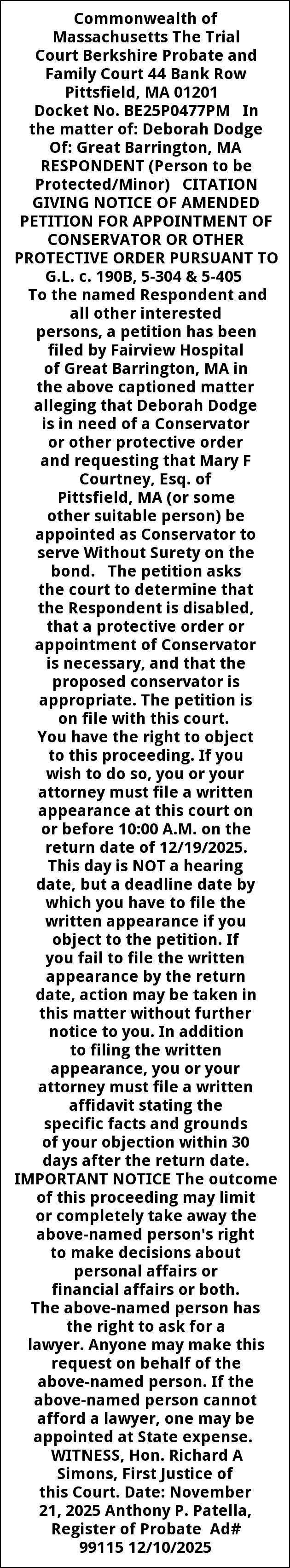 Commonwealth of Massachusetts The Trial Court Berkshire Probate and Family Court 44 Bank Row Pittsfield, MA 01201 Docket No. BE25P0477PM In the matter of: Deborah Dodge Of: Great Barrington, MA RESPONDENT (Person to be Protected/Minor) CITATION GIVING NOTICE OF AMENDED PETITION FOR APPOINTMENT OF CONSERVATOR OR OTHER PROTECTIVE ORDER PURSUANT TO G.L. c. 190B, 5-304 & 5-405 To the named Respondent and all other interested persons, a petition has been filed by Fairview Hospital of Great Barrington, MA in the above captioned matter alleging that Deborah Dodge is in need of a Conservator or other protective order and requesting that Mary F Courtney, Esq. of Pittsfield, MA (or some other suitable person) be appointed as Conservator to serve Without Surety on the bond. The petition asks the court to determine that the Respondent is disabled, that a protective order or appointment of Conservator is necessary, and that the proposed conservator is appropriate. The petition is on file with this court. You have the right to object to this proceeding. If you wish to do so, you or your attorney must file a written appearance at this court on or before 10:00 A.M. on the return date of 12/19/2025. This day is NOT a hearing date, but a deadline date by which you have to file the written appearance if you object to the petition. If you fail to file the written appearance by the return date, action may be taken in this matter without further notice to you. In addition to filing the written appearance, you or your attorney must file a written affidavit stating the specific facts and grounds of your objection within 30 days after the return date. IMPORTANT NOTICE The outcome of this proceeding may limit or completely take away the above-named person's right to make decisions about personal affairs or financial affairs or both. The above-named person has the right to ask for a lawyer. Anyone may make this request on behalf of the above-named person. If the above-named person cannot afford a lawyer, one may be appointed at State expense. WITNESS, Hon. Richard A Simons, First Justice of this Court. Date: November 21, 2025 Anthony P. Patella, Register of Probate Ad# 99115 12/10/2025