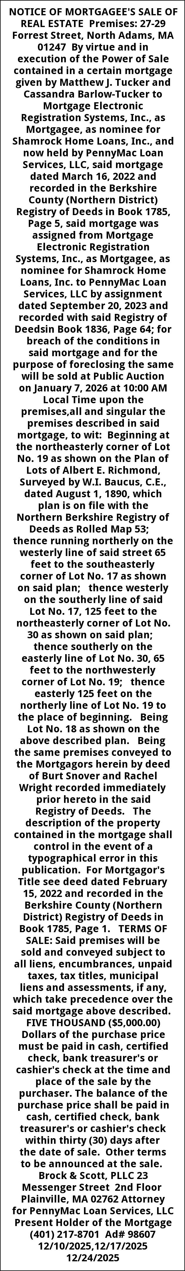NOTICE OF MORTGAGEE'S SALE OF REAL ESTATE Premises: 27-29 Forrest Street, North Adams, MA 01247 By virtue and in execution of the Power of Sale contained in a certain mortgage given by Matthew J. Tucker and Cassandra Barlow-Tucker to Mortgage Electronic Registration Systems, Inc., as Mortgagee, as nominee for Shamrock Home Loans, Inc., and now held by PennyMac Loan Services, LLC, said mortgage dated March 16, 2022 and recorded in the Berkshire County (Northern District) Registry of Deeds in Book 1785, Page 5, said mortgage was assigned from Mortgage Electronic Registration Systems, Inc., as Mortgagee, as nominee for Shamrock Home Loans, Inc. to PennyMac Loan Services, LLC by assignment dated September 20, 2023 and recorded with said Registry of Deedsin Book 1836, Page 64; for breach of the conditions in said mortgage and for the purpose of foreclosing the same will be sold at Public Auction on January 7, 2026 at 10:00 AM Local Time upon the premises,all and singular the premises described in said mortgage, to wit: Beginning at the northeasterly corner of Lot No. 19 as shown on the Plan of Lots of Albert E. Richmond, Surveyed by W.I. Baucus, C.E., dated August 1, 1890, which plan is on file with the Northern Berkshire Registry of Deeds as Rolled Map 53; thence running northerly on the westerly line of said street 65 feet to the southeasterly corner of Lot No. 17 as shown on said plan; thence westerly on the southerly line of said Lot No. 17, 125 feet to the northeasterly corner of Lot No. 30 as shown on said plan; thence southerly on the easterly line of Lot No. 30, 65 feet to the northwesterly corner of Lot No. 19; thence easterly 125 feet on the northerly line of Lot No. 19 to the place of beginning. Being Lot No. 18 as shown on the above described plan. Being the same premises conveyed to the Mortgagors herein by deed of Burt Snover and Rachel Wright recorded immediately prior hereto in the said Registry of Deeds. The description of the property contained in the mortgage shall control in the event of a typographical error in this publication. For Mortgagor's Title see deed dated February 15, 2022 and recorded in the Berkshire County (Northern District) Registry of Deeds in Book 1785, Page 1. TERMS OF SALE: Said premises will be sold and conveyed subject to all liens, encumbrances, unpaid taxes, tax titles, municipal liens and assessments, if any, which take precedence over the said mortgage above described. FIVE THOUSAND ($5,000.00) Dollars of the purchase price must be paid in cash, certified check, bank treasurer's or cashier's check at the time and place of the sale by the purchaser. The balance of the purchase price shall be paid in cash, certified check, bank treasurer's or cashier's check within thirty (30) days after the date of sale. Other terms to be announced at the sale. Brock & Scott, PLLC 23 Messenger Street 2nd Floor Plainville, MA 02762 Attorney for PennyMac Loan Services, LLC Present Holder of the Mortgage (401) 217-8701 Ad# 98607 12/10/2025,12/17/2025 12/24/2025