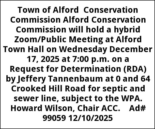Town of Alford Conservation Commission Alford Conservation Commission will hold a hybrid Zoom/Public Meeting at Alford Town Hall on Wednesday December 17, 2025 at 7:00 p.m. on a Request for Determination (RDA) by Jeffery Tannenbaum at 0 and 64 Crooked Hill Road for septic and sewer line, subject to the WPA. Howard Wilson, Chair ACC. Ad# 99059 12/10/2025